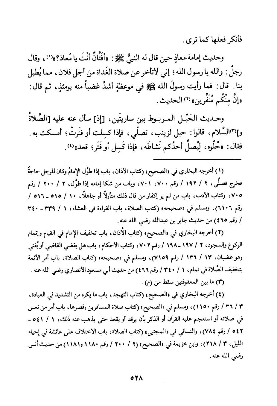 وَحَدِيثُ إِمَامَةِ مُعَاذٍ حِينَ قَالَ لَهُ النَّبِيُّ, صَلَّى اللَّهُ عَلَيْهِ وَسَلَّمَ: "أفتَّان أَنْتَ يَا مُعَاذُ؟ " 1، وَقَالَ رَجُلٌ: وَاللَّهِ يَا رَسُولَ اللَّهِ؛ إِنِّي لَأَتَأَخَّرُ عَنْ صَلَاةِ الْغَدَاةِ مِنْ أَجْلِ فُلَانٍ، مِمَّا يُطِيلُ بِنَا. قَالَ: فَمَا رَأَيْتُ رَسُولَ اللَّهِ -صَلَّى اللَّهُ عَلَيْهِ وَسَلَّمَ- فِي مَوْعِظَةٍ أَشَدَّ غَضَبًا مِنْهُ يَوْمَئِذٍ، ثُمَّ قَالَ: "إِنَّ مِنْكُمْ مُنَفِّرِينَ" 2 الحديث.