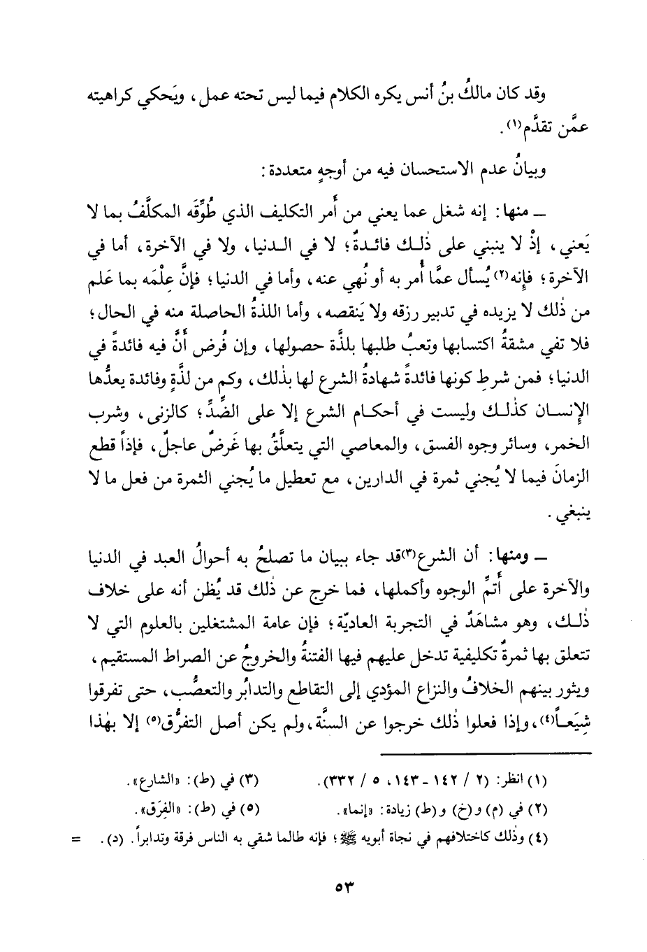 - وَمِنْهَا: أَنَّ الشَّرْعَ3 قَدْ جَاءَ بِبَيَانِ مَا تَصْلُحُ بِهِ أَحْوَالُ الْعَبْدِ فِي الدُّنْيَا وَالْآخِرَةِ عَلَى أَتَمِّ الْوُجُوهِ وَأَكْمَلِهَا، فَمَا خَرَجَ عَنْ ذَلِكَ قَدْ يُظن أَنَّهُ عَلَى خِلَافِ ذَلِكَ، وَهُوَ مُشَاهَدٌ فِي التَّجْرِبَةِ الْعَادِيَّةِ؛ فَإِنَّ عَامَّةَ الْمُشْتَغِلِينَ بِالْعُلُومِ الَّتِي لَا تَتَعَلَّقُ بِهَا ثَمَرَةٌ تَكْلِيفِيَّةٌ تَدْخُلُ عَلَيْهِمْ فِيهَا الْفِتْنَةُ وَالْخُرُوجُ عَنِ الصِّرَاطِ الْمُسْتَقِيمِ، وَيَثُورُ بَيْنَهُمُ الْخِلَافُ وَالنِّزَاعُ الْمُؤَدِّي إِلَى التَّقَاطُعِ وَالتَّدَابُرِ والتعصُّب، حَتَّى تَفَرَّقُوا شِيَعًا4، وَإِذَا فَعَلُوا ذَلِكَ خَرَجُوا عَنِ السُّنَّةِ، ولم يكن أصل التفرق5 إلا بهذا