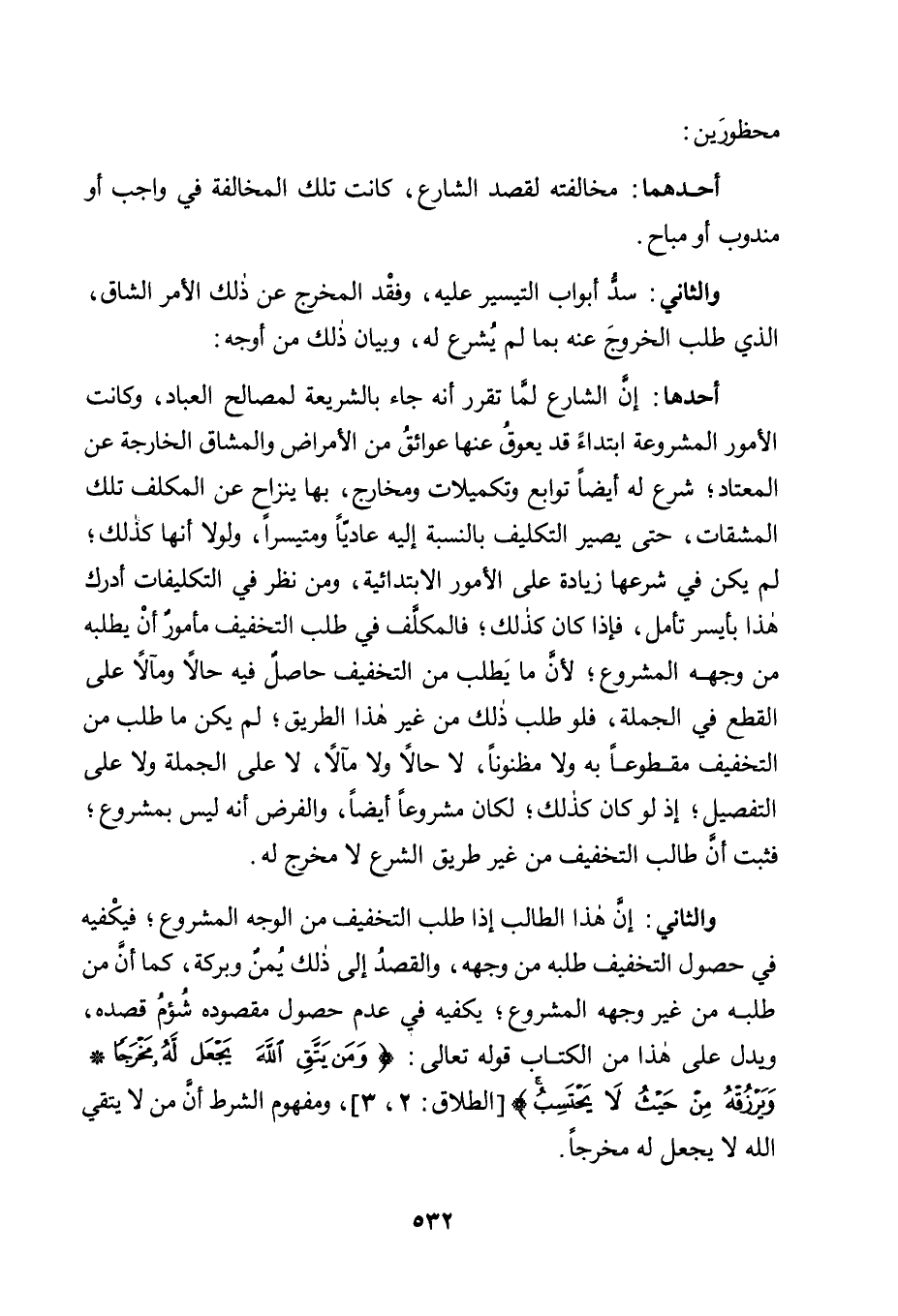 إِنَّ الشَّارِعَ لَمَّا تَقَرَّرَ أَنَّهُ جَاءَ بِالشَّرِيعَةِ لِمَصَالِحِ الْعِبَادِ، وَكَانَتِ الْأُمُورُ الْمَشْرُوعَةُ ابْتِدَاءً قَدْ يَعُوقُ عَنْهَا عَوَائِقُ مِنَ الْأَمْرَاضِ وَالْمَشَاقِّ الْخَارِجَةِ عَنِ الْمُعْتَادِ؛ شَرَعَ لَهُ أَيْضًا تَوَابِعَ وَتَكْمِيلَاتٍ وَمَخَارِجَ، بِهَا يَنْزَاحُ عَنِ الْمُكَلَّفِ تِلْكَ الْمَشَقَّاتُ، حَتَّى يَصِيرَ التَّكْلِيفُ بِالنِّسْبَةِ إِلَيْهِ عَادِيًّا وَمُتَيَسِّرًا، وَلَوْلَا أَنَّهَا كَذَلِكَ؛ لَمْ يَكُنْ فِي شَرْعِهَا زِيَادَةٌ عَلَى الْأُمُورِ الِابْتِدَائِيَّةِ، وَمَنْ نَظَرَ فِي التَّكْلِيفَاتِ أَدْرَكَ هَذَا بِأَيْسَرِ تَأْمُّلٍ، فَإِذَا كَانَ كَذَلِكَ؛ فَالْمُكَلَّفُ فِي طَلَبِ التَّخْفِيفِ مَأْمُورٌ أَنْ يَطْلُبَهُ مِنْ وَجْهِهِ الْمَشْرُوعِ؛ لِأَنَّ مَا يُطْلَبُ مِنَ التَّخْفِيفِ حَاصِلٌ فِيهِ حَالًا وَمَآلًا عَلَى الْقَطْعِ فِي الْجُمْلَةِ، فَلَوْ طَلَبَ ذَلِكَ مِنْ غَيْرِ هَذَا الطَّرِيقِ؛ لَمْ يَكُنْ مَا طَلَبَ مِنَ التَّخْفِيفِ مَقْطُوعًا بِهِ وَلَا مَظْنُونًا، لَا حَالًا وَلَا مَآلًا، لَا عَلَى الْجُمْلَةِ وَلَا عَلَى التَّفْصِيلِ؛ إِذْ لَوْ كَانَ كَذَلِكَ؛ لَكَانَ مَشْرُوعًا أَيْضًا، وَالْفَرْضُ أَنَّهُ لَيْسَ بِمَشْرُوعٍ؛ فَثَبَتَ أَنَّ طَالِبَ التَّخْفِيفِ مِنْ غَيْرِ طَرِيقِ الشَّرْعِ لَا مَخْرَجَ لَهُ.