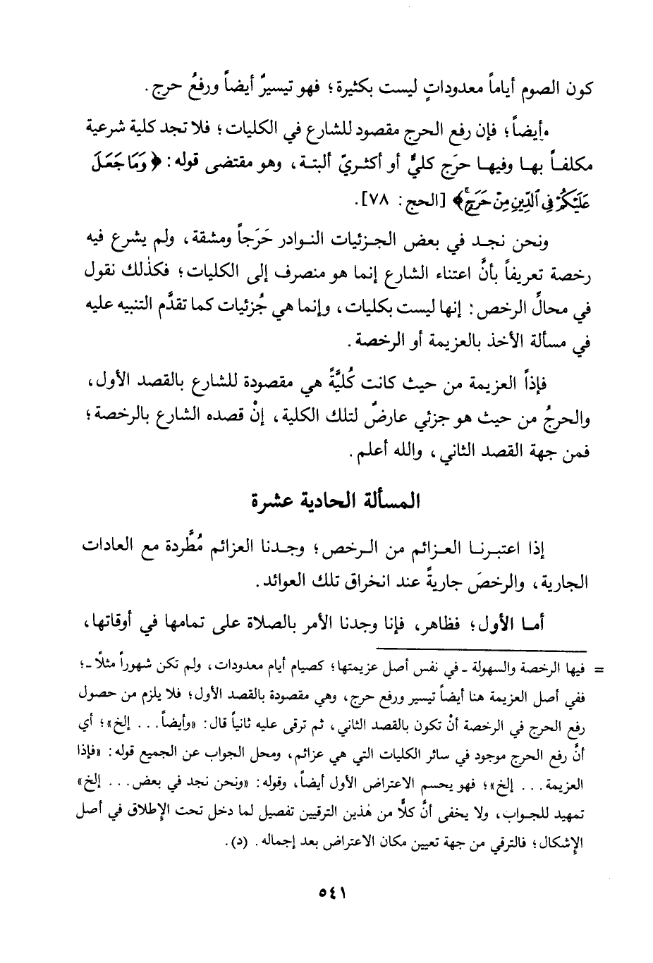 وَأَيْضًا؛ فَإِنَّ رَفْعَ الْحَرَجِ مَقْصُودٌ لِلشَّارِعِ فِي الْكُلِّيَّاتِ؛ فَلَا تَجِدُ كُلِّيَّةً شَرْعِيَّةً مُكَلَّفًا بِهَا وَفِيهَا حَرَجٌ كُلِّيٌّ أَوْ أَكْثَرِيٌّ أَلْبَتَّةَ، وَهُوَ مُقْتَضَى قَوْلِهِ: {وَمَا جَعَلَ عَلَيْكُمْ فِي الدِّينِ مِنْ حَرَجٍ} [الْحَجِّ: 78] .
