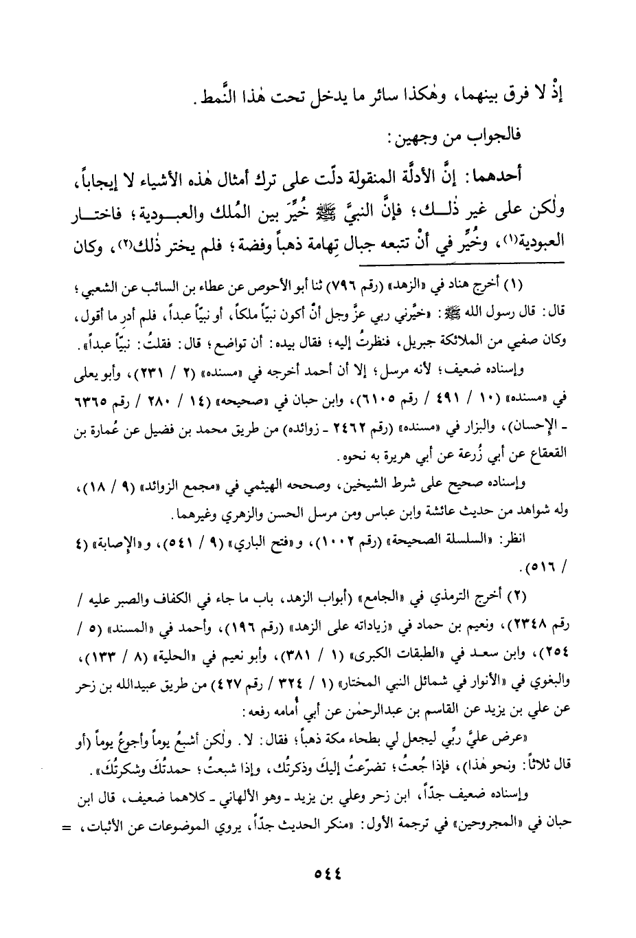 إِنَّ الْأَدِلَّةَ الْمَنْقُولَةَ دَلَّتْ عَلَى تَرْكِ أَمْثَالِ هَذِهِ الْأَشْيَاءِ لَا إِيجَابًا، وَلَكِنْ عَلَى غَيْرِ ذَلِكَ؛ فَإِنَّ النَّبِيَّ -صَلَّى اللَّهُ عَلَيْهِ وَسَلَّمَ- خُيِّرَ بَيْنَ الْمُلْكِ وَالْعُبُودِيَّةِ؛ فَاخْتَارَ الْعُبُودِيَّةَ1، وَخُيِّرَ فِي أَنْ تَتْبَعَهُ جِبَالُ تِهَامَةَ ذَهَبًا وفضة؛ فلم يختر ذلك2، وكان