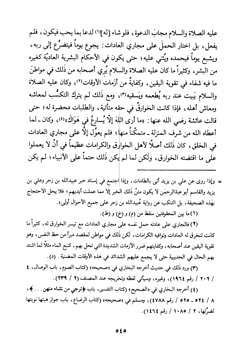 2 فالجاري على عادته حمل نفسه على مجاري العادات مع تيسر الخوارق له، كثيرا ما كانت تنخرق له العادات وتوافيه الكرامات، لكن ذلك في مواطن لمقصد مبرأ من حظ النفس، وهو تقوية اليقين عند أصحابه، وكفايتهم ضرر الأزمات الشديدة التي تحل بهم، كنبع الماء مثلا لما اشتد بهم الحال في الحديبية حتى لا يجمع عليهم الشدائد في هذه الأوقات المضنية. "د".