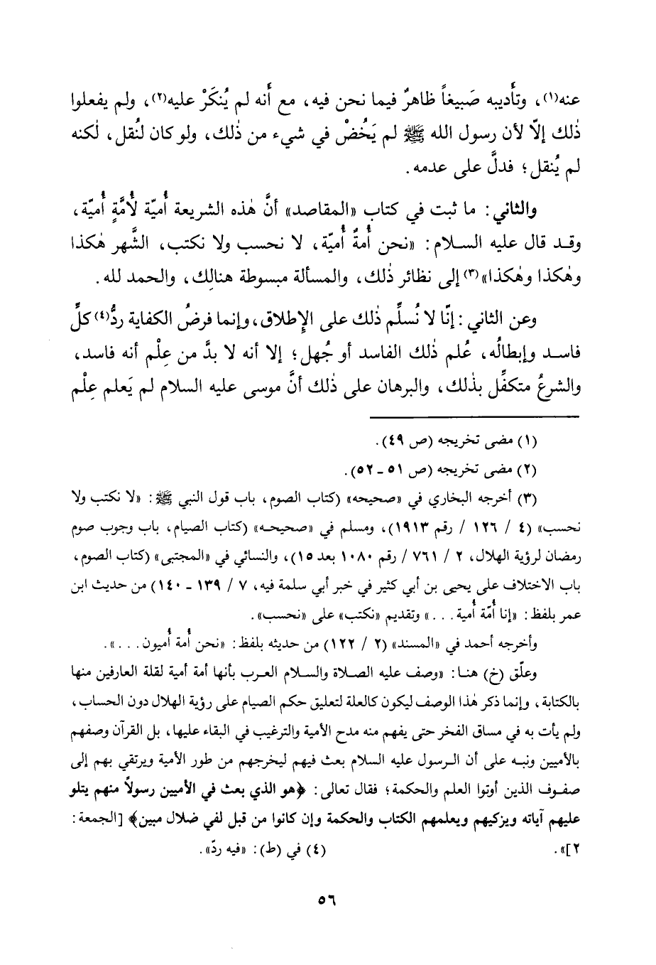 وَالثَّانِي: مَا ثَبَتَ فِي كِتَابِ "الْمَقَاصِدِ" أَنَّ هَذِهِ الشَّرِيعَةَ أُمِّيَّةٌ لِأُمَّةٍ أُمِّيَّةٍ، وَقَدْ قَالَ عَلَيْهِ السَّلَامُ: "نَحْنُ أُمَّةٌ أُمِّيَّةٌ، لا نحسب ولا نكتب، الشهر هكذا وهكذا وَهَكَذَا" 3 إِلَى نَظَائِرِ ذَلِكَ، وَالْمَسْأَلَةُ مَبْسُوطَةٌ هُنَالِكَ، وَالْحَمْدُ لِلَّهِ.