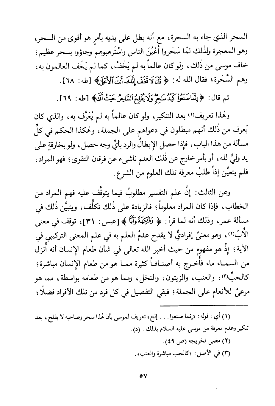وَعَنِ الثَّالِثِ: إِنَّ عِلْمَ التَّفْسِيرِ مطلوبٌ فِيمَا يَتَوَقَّفُ عَلَيْهِ فَهْمُ الْمُرَادِ مِنَ الْخِطَابِ، فَإِذَا كَانَ الْمُرَادُ مَعْلُومًا؛ فَالزِّيَادَةُ عَلَى ذَلِكَ تَكَلُّفٌ، وَيَتَبَيَّنُ ذَلِكَ فِي مَسْأَلَةِ عُمَرَ، وَذَلِكَ أَنَّهُ لَمَّا قَرَأَ: {وَفَاكِهَةً وَأَبًّا} [عَبَسَ: 31] ، تَوَقَّفَ فِي مَعْنَى الْأَبِّ2، وَهُوَ مَعْنًى إِفْرَادِيٌّ لَا يَقْدَحُ عَدَمُ الْعِلْمِ بِهِ فِي عِلْمِ الْمَعْنَى التَّرْكِيبِيِّ فِي الْآيَةِ؛ إِذْ هُوَ مَفْهُومٌ مِنْ حَيْثُ أَخْبَرَ اللَّهُ تَعَالَى فِي شَأْنِ طَعَامِ الْإِنْسَانِ أَنَّهُ أَنْزَلَ مِنَ السَّمَاءِ مَاءً فَأَخْرَجَ بِهِ أَصْنَافًا كَثِيرَةً مِمَّا هُوَ مِنْ طَعَامِ الْإِنْسَانِ مُبَاشَرَةً؛ كَالْحَبِّ3، وَالْعِنَبِ، وَالزَّيْتُونِ، وَالنَّخْلِ، وَمِمَّا هُوَ مِنْ طَعَامِهِ بِوَاسِطَةٍ، مِمَّا هُوَ مَرْعًى لِلْأَنْعَامِ عَلَى الْجُمْلَةِ؛ فَبَقِيَ التَّفْصِيلُ فِي كُلِّ فَرْدٍ مِنْ تلك الأفراد فضلا؛