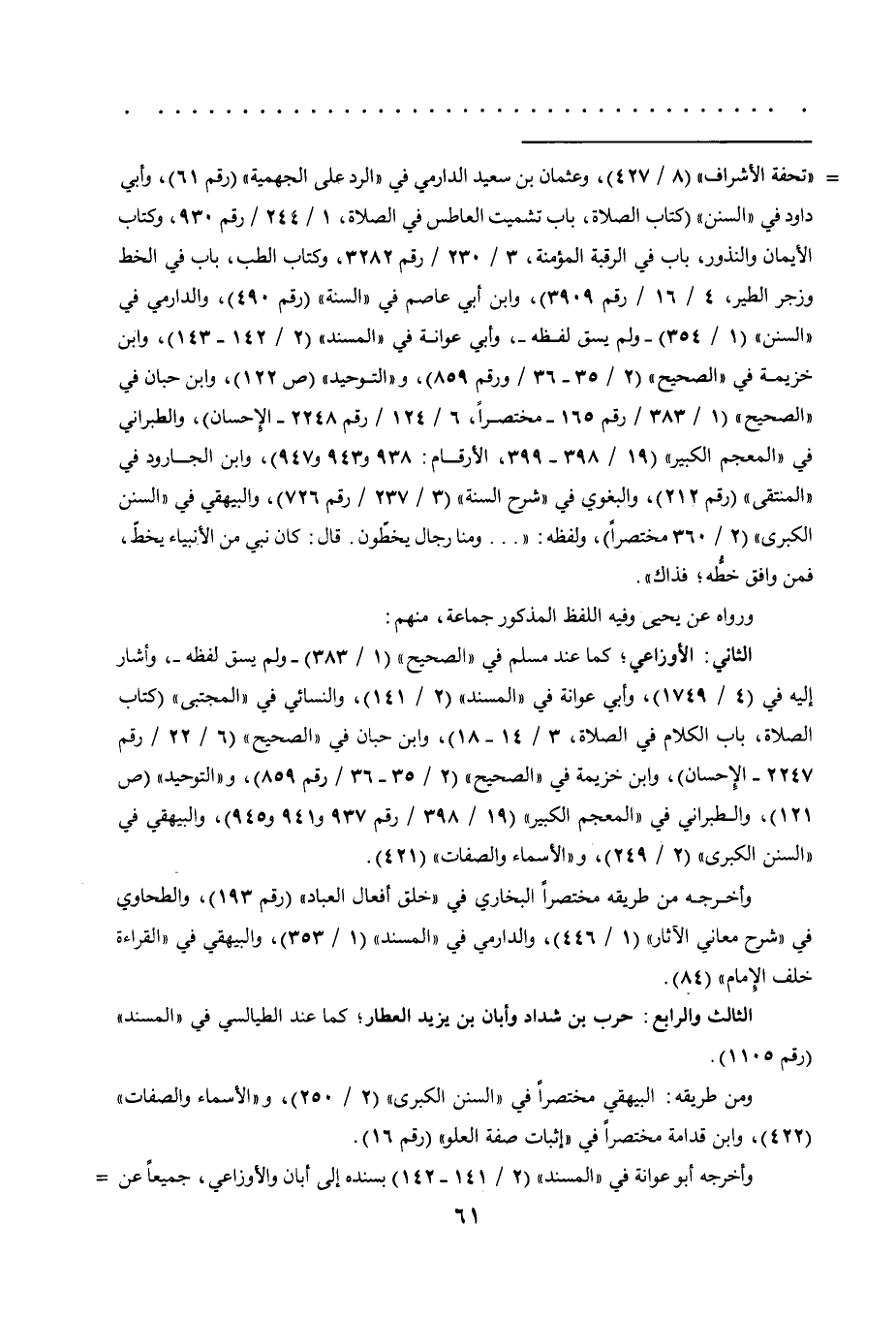 = "تحفة الأشراف" "8/ 427"، وعثمان بن سعيد الدارمي في "الرد على الجهمية" "رقم 61"، وأبي داود في "السنن" "كتاب الصلاة، باب تشميت العاطس في الصلاة، 1/ 244/ رقم 930، وكتاب الأيمان والنذور، باب في الرقبة المؤمنة، 3/ 230/ رقم 3282، وكتاب الطب، باب في الخط وزجر الطير، 4/ 16/ رقم 3909"، وابن أبي عاصم في "السنة" "رقم 490"، والدارمي في "السنن" "1/ 354" -ولم يسق لفظه- وأبي عوانة في "المسند" "2/ 142-143"، وابن خزيمة في "الصحيح" "2/ 35-36/ ورقم 859"، و"التوحيد" "ص122"، وابن حبان في "الصحيح" "1/ 383/ رقم 165- مختصرا، 6/ 124/ رقم 2248- الإحسان"، والطبراني في "المعجم الكبير" "19/ 398-399، الأرقام: 938 و943 و947"، وابن الجارود في "المنتقى" "رقم 212"، والبغوي في "شرح السنة" "3/ 237/ رقم 726"، والبيهقي في "السنن الكبرى" "2/ 360 مختصرا"، ولفظه: ... ومنا رجال يخطون. قال: "كان نبي من الأنبياء يخط، فمن وافق خطه؛ فذاك".