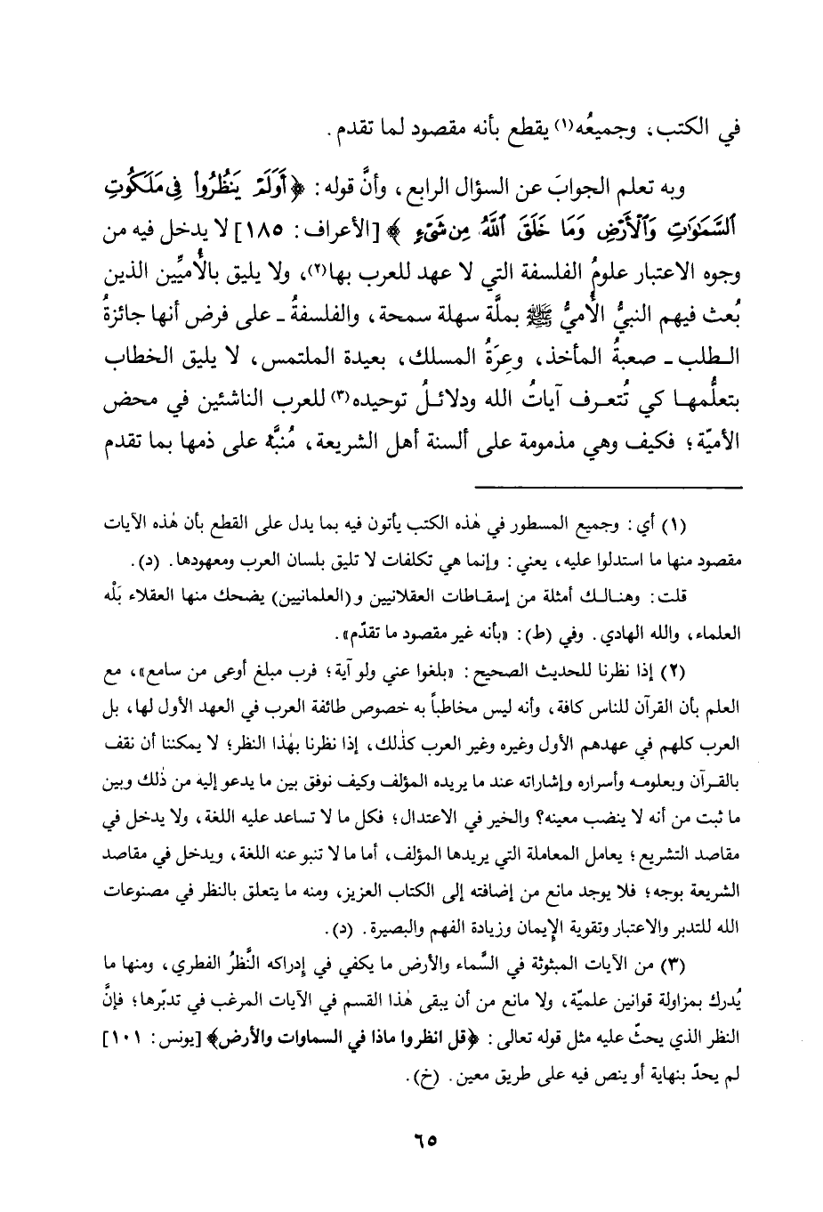 وَبِهِ تَعْلَمُ الْجَوَابَ عَنِ السُّؤَالِ الرَّابِعِ، وَأَنَّ قَوْلَهُ: {أَوَلَمْ يَنْظُرُوا فِي مَلَكُوتِ السَّمَاوَاتِ وَالْأَرْضِ وَمَا خَلَقَ اللَّهُ مِنْ شَيْءٍ} [الْأَعْرَافِ: 185] لَا يَدْخُلُ فِيهِ مِنْ وُجُوهِ الِاعْتِبَارِ عُلُومُ الْفَلْسَفَةِ الَّتِي لَا عَهْدَ لِلْعَرَبِ بِهَا2، وَلَا يليق بالأميين الذين بُعث فيهم النبي الأمي -صلى الله عليه وسلم- بِمِلَّةٍ سَهْلَةٍ سَمْحَةٍ، وَالْفَلْسَفَةُ -عَلَى فَرْضِ أَنَّهَا جَائِزَةُ الطَّلَبِ- صَعْبَةُ الْمَأْخَذِ، وَعِرَةُ الْمَسْلَكِ، بَعِيدَةُ الْمُلْتَمَسِ، لَا يَلِيقُ الْخِطَابُ بِتَعَلُّمِهَا كَيْ تُتعرف آيَاتِ اللَّهِ وَدَلَائِلَ تَوْحِيدِهِ3 لِلْعَرَبِ النَّاشِئِينَ فِي مَحْضِ الْأُمِّيَّةِ؛ فَكَيْفَ وَهِيَ مَذْمُومَةٌ عَلَى أَلْسِنَةِ أَهْلِ الشَّرِيعَةِ، مُنبَّه عَلَى ذَمِّهَا بِمَا تَقَدَّمَ