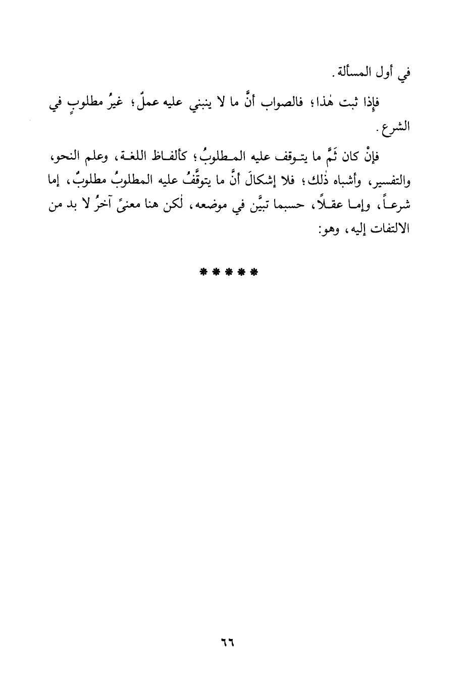 فَإِنْ كَانَ ثَمَّ مَا يَتَوَقَّفُ عَلَيْهِ الْمَطْلُوبُ؛ كَأَلْفَاظِ اللُّغَةِ، وَعِلْمِ النَّحْوِ، وَالتَّفْسِيرِ، وَأَشْبَاهِ ذَلِكَ؛ فَلَا إِشْكَالَ أَنَّ مَا يَتَوَقَّفُ عَلَيْهِ الْمَطْلُوبُ مَطْلُوبٌ، إِمَّا شَرْعًا، وَإِمَّا عَقْلًا، حَسْبَمَا تبيَّن فِي مَوْضِعِهِ، لَكِنْ هُنَا معنى آخر لا بد من الالتفات إليه، وهو: