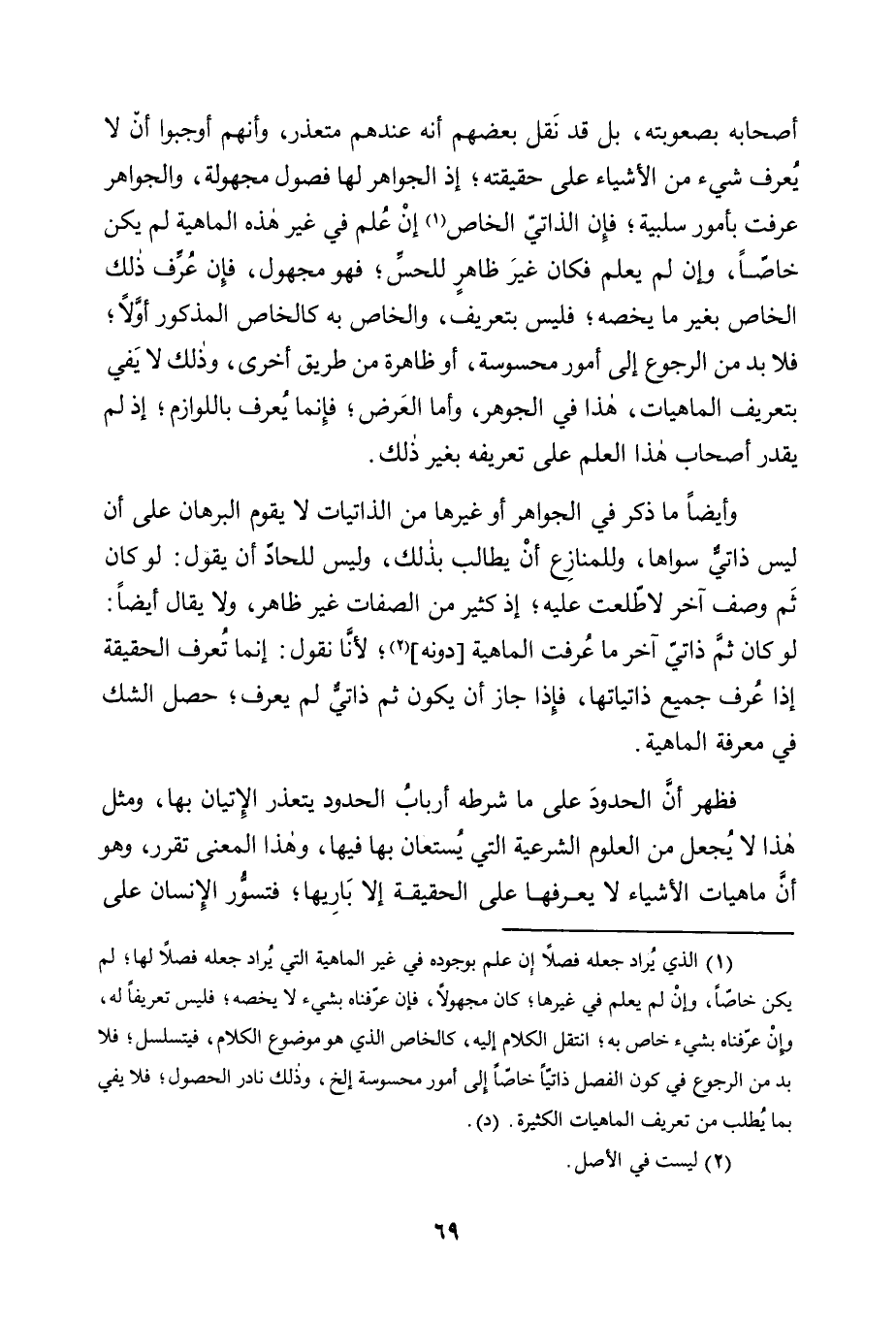 1الذي يُراد جعله فصلا إن علم بوجوده في غير الماهية التي يُراد جعله فصلا لها؛ لم يكن خاصا، وإن لم يعلم في غيرها؛ كان مجهولا، فإن عرّفناه بشيء لا يخصه؛ فليس تعريفا له، وإن عرّفناه بشيء خاص به؛ انتقل الكلام إليه، كالخاص الذي هو موضوع الكلام، فيتسلسل؛ فلا بد من الرجوع في كون الفصل ذاتيا خاصا إلى أمور محسوسة ... إلخ، وذلك نادر الحصول؛ فلا يفي بما يُطلب من تعريف الماهيات الكثيرة "د".