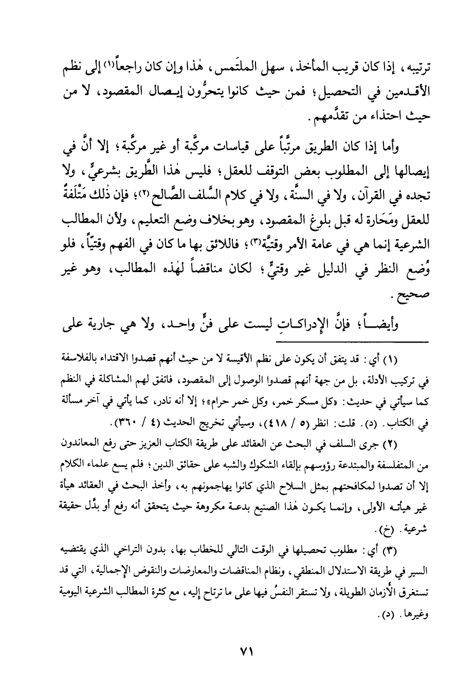 وَأَمَّا إِذَا كَانَ الطَّرِيقُ مُرَتَّبًا عَلَى قِيَاسَاتٍ مُرَكَّبَةٍ أَوْ غَيْرِ مُرَكَّبَةٍ؛ إِلَّا أَنَّ فِي إِيصَالِهَا إِلَى الْمَطْلُوبِ بَعْضَ التَّوَقُّفِ لِلْعَقْلِ؛ فَلَيْسَ هَذَا الطَّرِيقُ بِشَرْعِيٍّ، وَلَا تَجِدُهُ فِي الْقُرْآنِ، وَلَا فِي السُّنَّةِ، وَلَا فِي كَلَامِ السَّلَفِ الصَّالِحِ2؛ فَإِنَّ ذَلِكَ مَتْلَفَةٌ لِلْعَقْلِ وَمَحَارَةٌ لَهُ قَبْلَ بُلُوغِ الْمَقْصُودِ، وَهُوَ بِخِلَافِ وَضْعِ التَّعْلِيمِ، وَلِأَنَّ الْمَطَالِبَ الشَّرْعِيَّةَ إِنَّمَا هِيَ فِي عَامَّةِ الْأَمْرِ وَقْتِيَّةٌ3؛ فَاللَّائِقُ بِهَا مَا كَانَ فِي الْفَهْمِ وَقْتِيًّا، فَلَوْ وُضِعَ النَّظَرُ فِي الدَّلِيلِ غَيْرَ وَقْتِيٍّ؛ لَكَانَ مُنَاقِضًا لِهَذِهِ الْمَطَالِبِ، وَهُوَ غَيْرُ صَحِيحٍ.