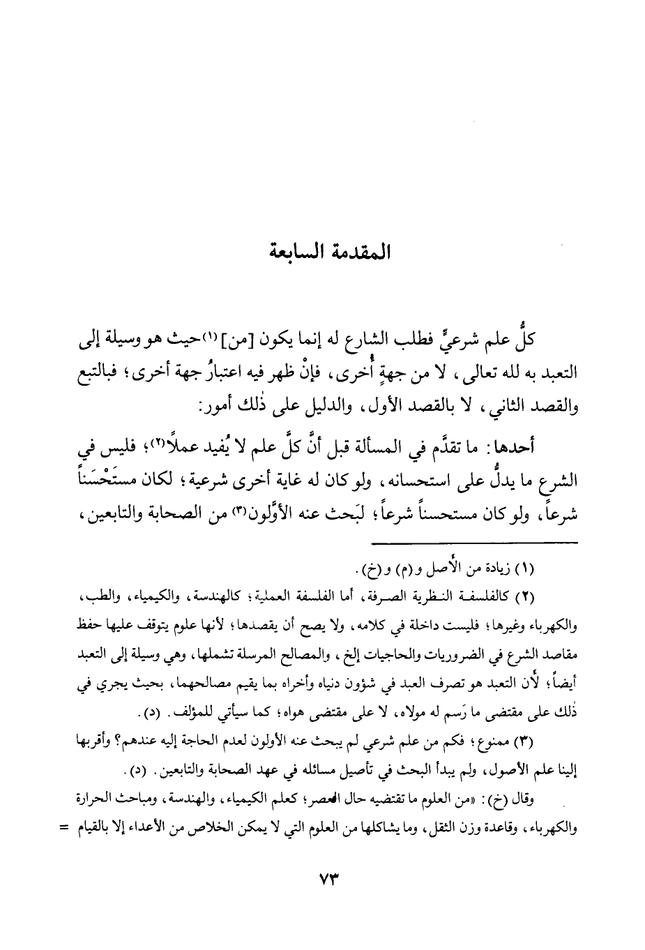 وقال "خ": "من العلوم ما تقتضيه حال العصر؛ كعلم الكيمياء، والهندسة، ومباحث الحرارة والكهرباء، وقاعدة وزن الثقل، وما يشاكلها من العلوم التي لا يمكن الخلاص من الأعداء إلا بالقيام عليها، ولم يبحث عنها الأولون من الصحابة والتابعين؛ لأن الحاجة الداعية إلى تعلمها لم تظهر في ذلك العهد بمثل الوجه الذي ظهرت به اليوم".
