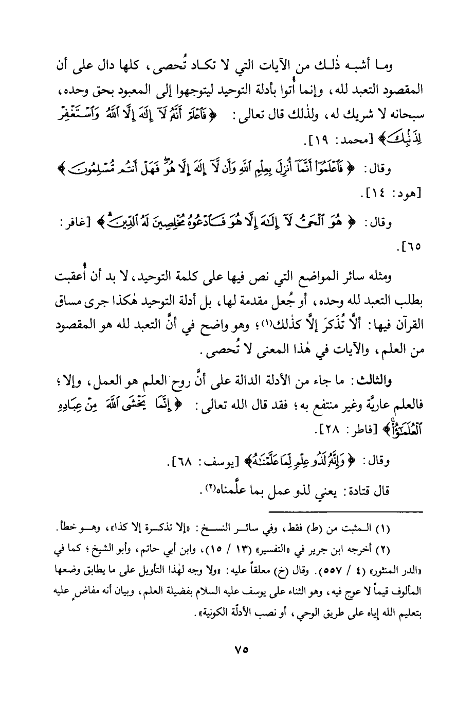 وَمَثَلُهُ سَائِرُ الْمَوَاضِعِ الَّتِي نُصَّ فِيهَا عَلَى كَلِمَةِ التَّوْحِيدِ، لَا بُدَّ أَنْ أُعقبت بِطَلَبِ التَّعَبُّدِ لِلَّهِ وَحْدَهُ، أَوْ جُعل مُقَدِّمَةً لَهَا، بَلْ أَدِلَّةُ التَّوْحِيدِ هَكَذَا جَرَى مَسَاقُ الْقُرْآنِ فِيهَا: أَلَّا تُذكر إِلَّا كَذَلِكَ1؛ وَهُوَ وَاضِحٌ فِي أَنَّ التَّعَبُّدَ لِلَّهِ هُوَ الْمَقْصُودُ مِنَ الْعِلْمِ، وَالْآيَاتُ فِي هَذَا الْمَعْنَى لَا تُحصى.