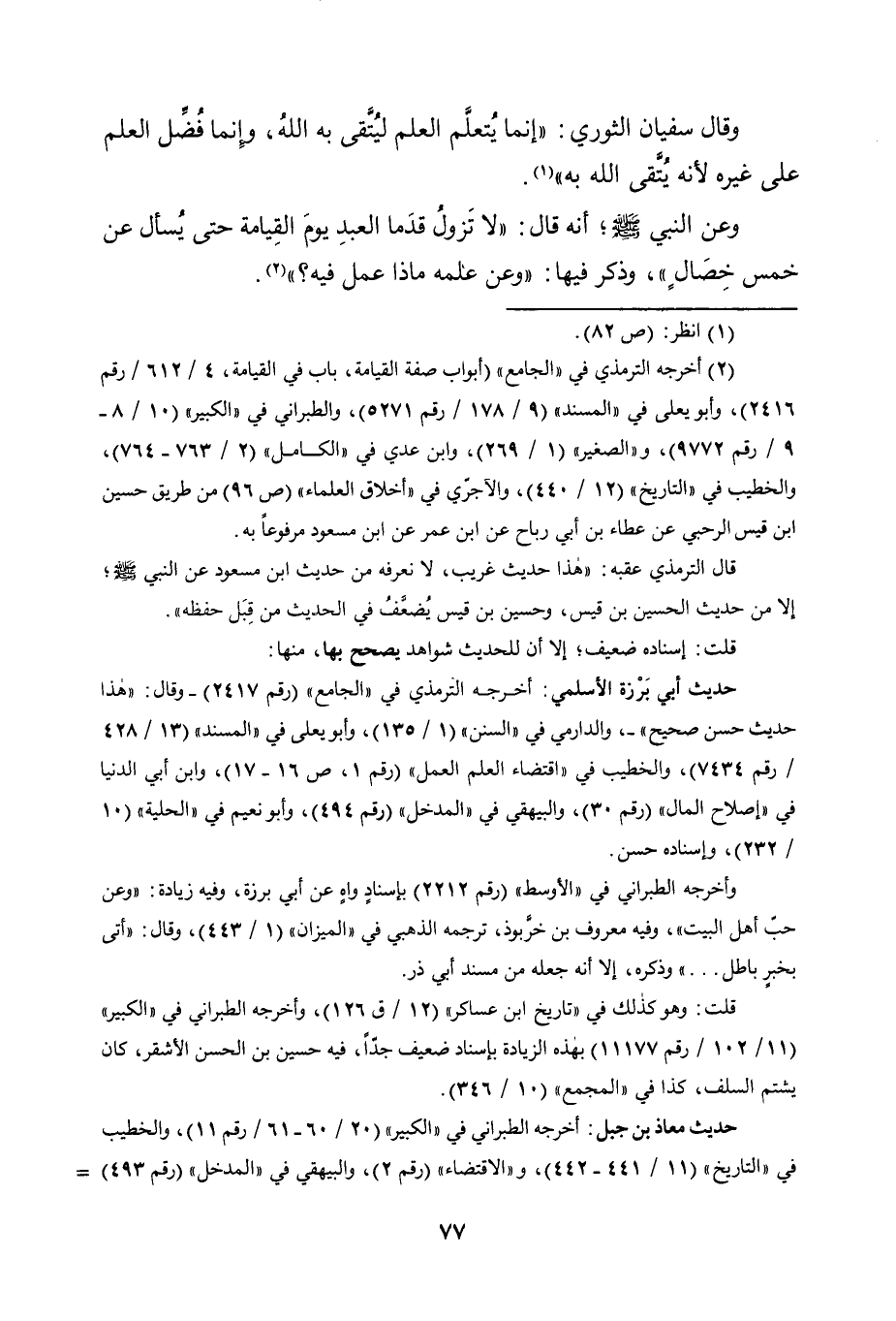 حديث أبي بَرْزة الأسلمي: أخرجه الترمذي في "الجامع" "رقم 2417" -وقال: "هذا حديث حسن صحيح"- والدارمي في "السنن" "1/ 135"، وأبو يعلى في "المسند" "13/ 428/ رقم 7434"، والخطيب في "اقتضاء العلم العمل" "رقم 1، ص16-17"، وابن أبي الدنيا في "إصلاح المال" "رقم 30"، والبيهقي في "المدخل" "رقم 494"، وأبو نعيم في الحلية "10/ 232"، وإسناده حسن.