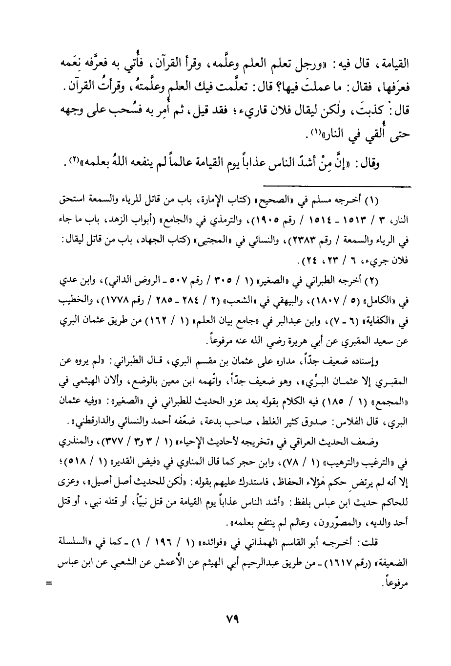 الْقِيَامَةِ، قَالَ فِيهِ: "وَرَجُلٌ تَعَلَّمَ الْعِلْمَ وعلَّمه، وَقَرَأَ الْقُرْآنَ، فأُتي بِهِ فعرَّفه نِعَمه فَعَرَفَهَا، فَقَالَ: مَا عَمِلْتَ فِيهَا؟ قَالَ: تعلَّمت فِيكَ الْعِلْمَ وعلَّمته، وقرأتُ الْقُرْآنَ. قَالَ: كَذَّبْتَ، وَلَكِنْ لِيُقَالَ: فُلَانٌ قَارِئٌ؛ فَقَدْ قِيلَ، ثُمَّ أُمر بِهِ فسُحب عَلَى وَجْهِهِ حَتَّى أُلقي فِي النَّارِ "1.