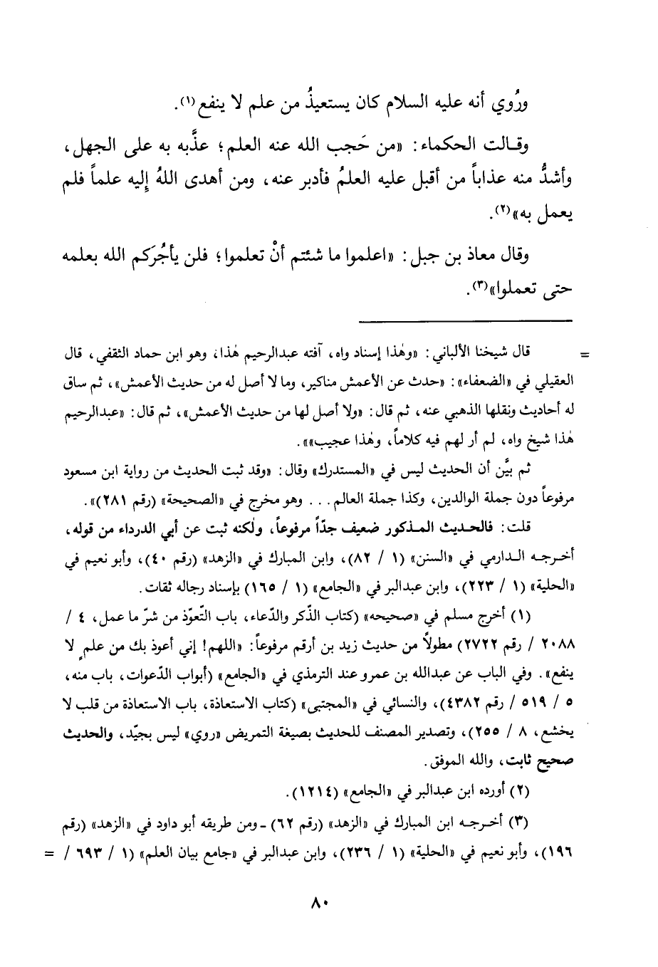 وَرُوِيَ أَنَّهُ -عَلَيْهِ السَّلَامُ- كَانَ يَسْتَعِيذُ مِنْ عِلْمٍ لَا يَنْفَعُ1.