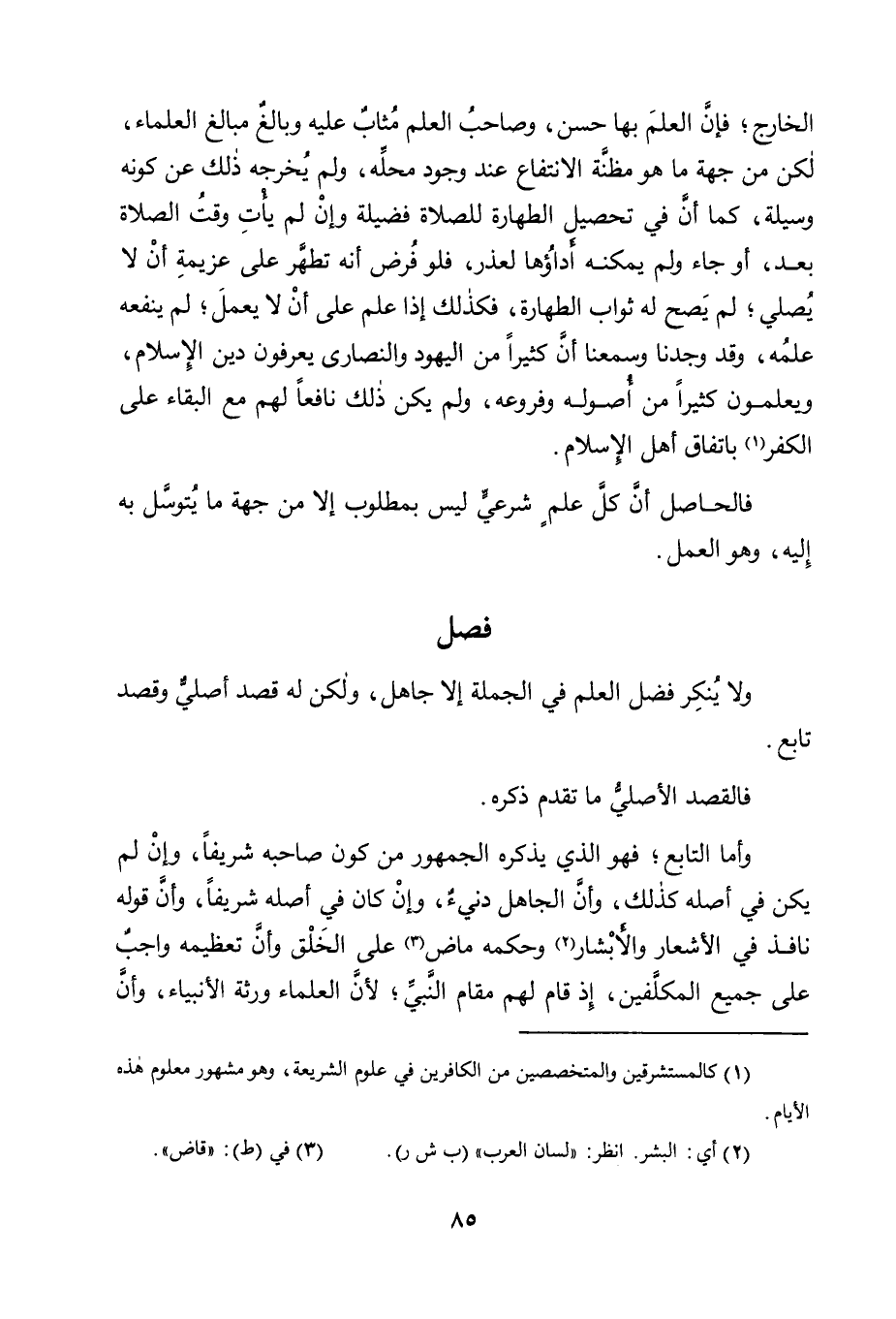 وَلَا يُنكر فَضْلَ الْعِلْمِ فِي الْجُمْلَةِ إِلَّا جَاهِلٌ، وَلَكِنْ لَهُ قَصْدٌ أَصْلِيٌّ وَقَصْدٌ تَابِعٌ.