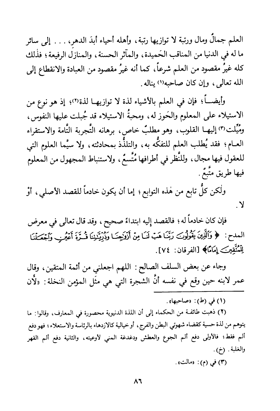 الْعِلْمَ جَمَالٌ وَمَالٌ وَرُتْبَةٌ لَا تُوَازِيهَا رُتْبَةٌ، وَأَهْلُهُ أَحْيَاءٌ أَبَدَ الدَّهْرِ، ... إِلَى سَائِرِ مَا لَهُ فِي الدُّنْيَا مِنَ الْمَنَاقِبِ الْحَمِيدَةِ، وَالْمَآثِرِ الْحَسَنَةِ، وَالْمَنَازِلِ الرَّفِيعَةِ؛ فَذَلِكَ كُلُّهُ غَيْرُ مَقْصُودٍ مِنَ الْعِلْمِ شَرْعًا، كَمَا أَنَّهُ غَيْرُ مَقْصُودٍ مِنَ الْعِبَادَةِ وَالِانْقِطَاعِ إِلَى اللَّهِ تَعَالَى، وَإِنْ كَانَ صَاحِبُهُ1 يَنَالُهُ.