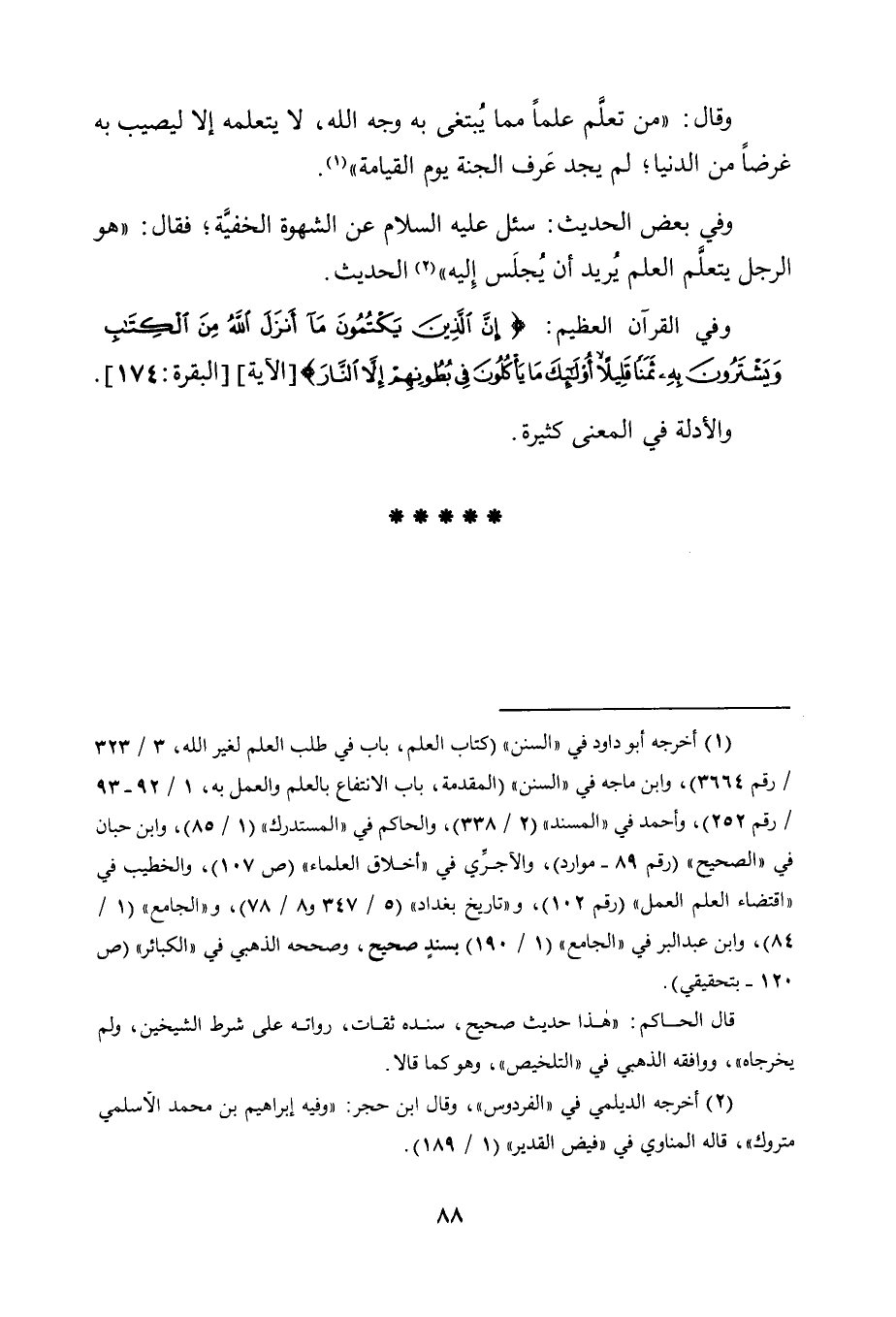 1 أخرجه أبوداود في "السنن" "كتاب العلم، باب في طلب العلم لغير الله، 3/ 323/ رقم 3664"، وابن ماجه في "السنن" "المقدمة، باب الانتفاع بالعلم والعمل به، 1/ 92-93/ رقم 252"، وأحمد في "المسند" "2/ 338"، والحاكم في "المستدرك" "1/ 85"، وابن حبان في "الصحيح" "رقم 89- موارد" والآجري في "أخلاق العلماء" "ص107"، والخطيب في "اقتضاء العلم العمل" "رقم 102"، و"تاريخ بغداد" "5/ 347 و8/ 78"، و"الجامع" "1/ 84"، وابن عبد البر في "الجامع" "1/ 190" بسند صحيح، وصححه الذهبي في "الكبائر" "ص120- بتحقيقي".