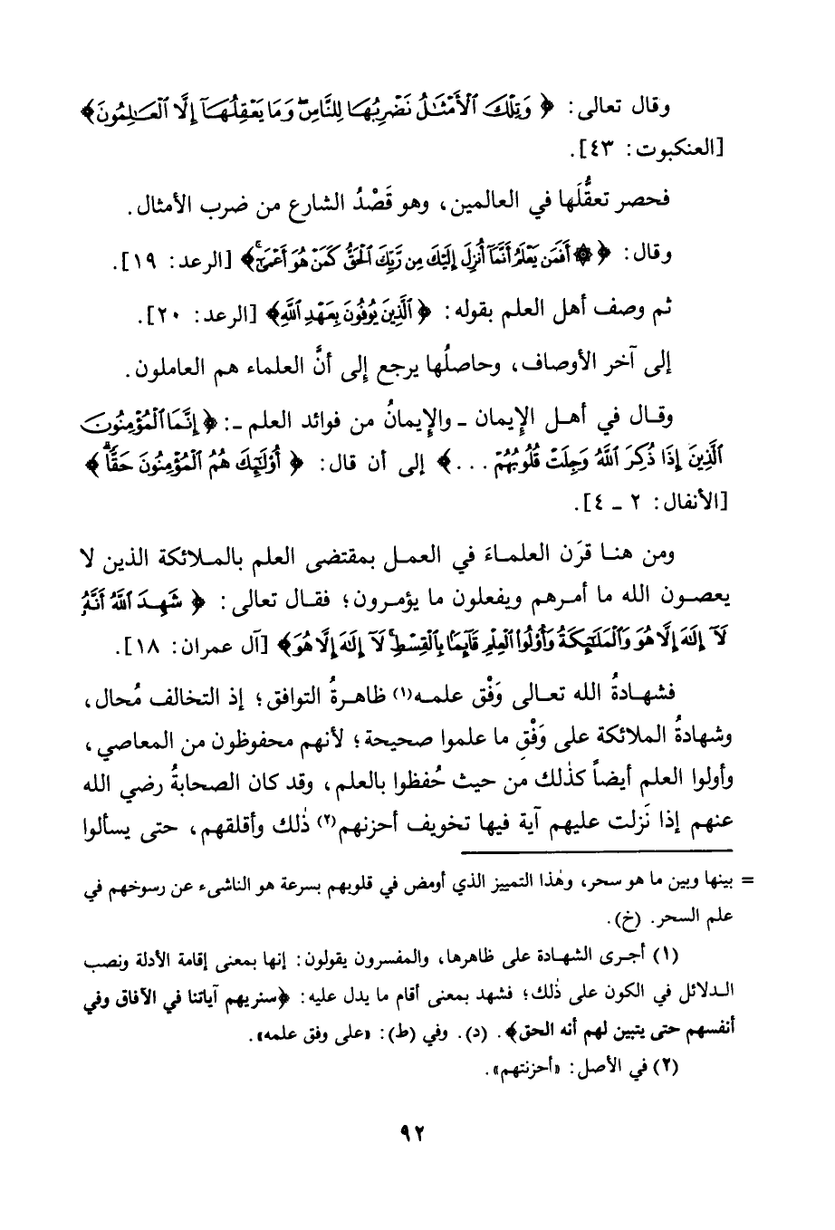 1 أجرى الشهادة على ظاهرها، والمفسرون يقولون: إنها بمعنى إقامة الأدلة ونصب الدلائل في الكون على ذلك؛ فشهد بمعنى أقام ما يدل عليه: {سَنُرِيهِمْ آيَاتِنَا فِي الْآفَاقِ وَفِي أَنْفُسِهِمْ حَتَّى يَتَبَيَّنَ لَهُمْ أَنَّهُ الْحَقُّ} . "د" وفي "ط": "على وفق علمه".