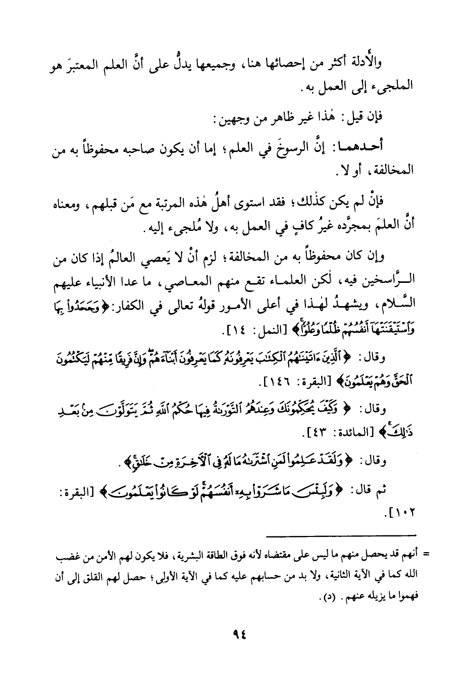 أَحَدُهُمَا: أَنَّ الرُّسُوخَ فِي الْعِلْمِ؛ إِمَّا أَنْ يَكُونَ صَاحِبُهُ مَحْفُوظًا بِهِ مِنَ المخالفة، أو لا.