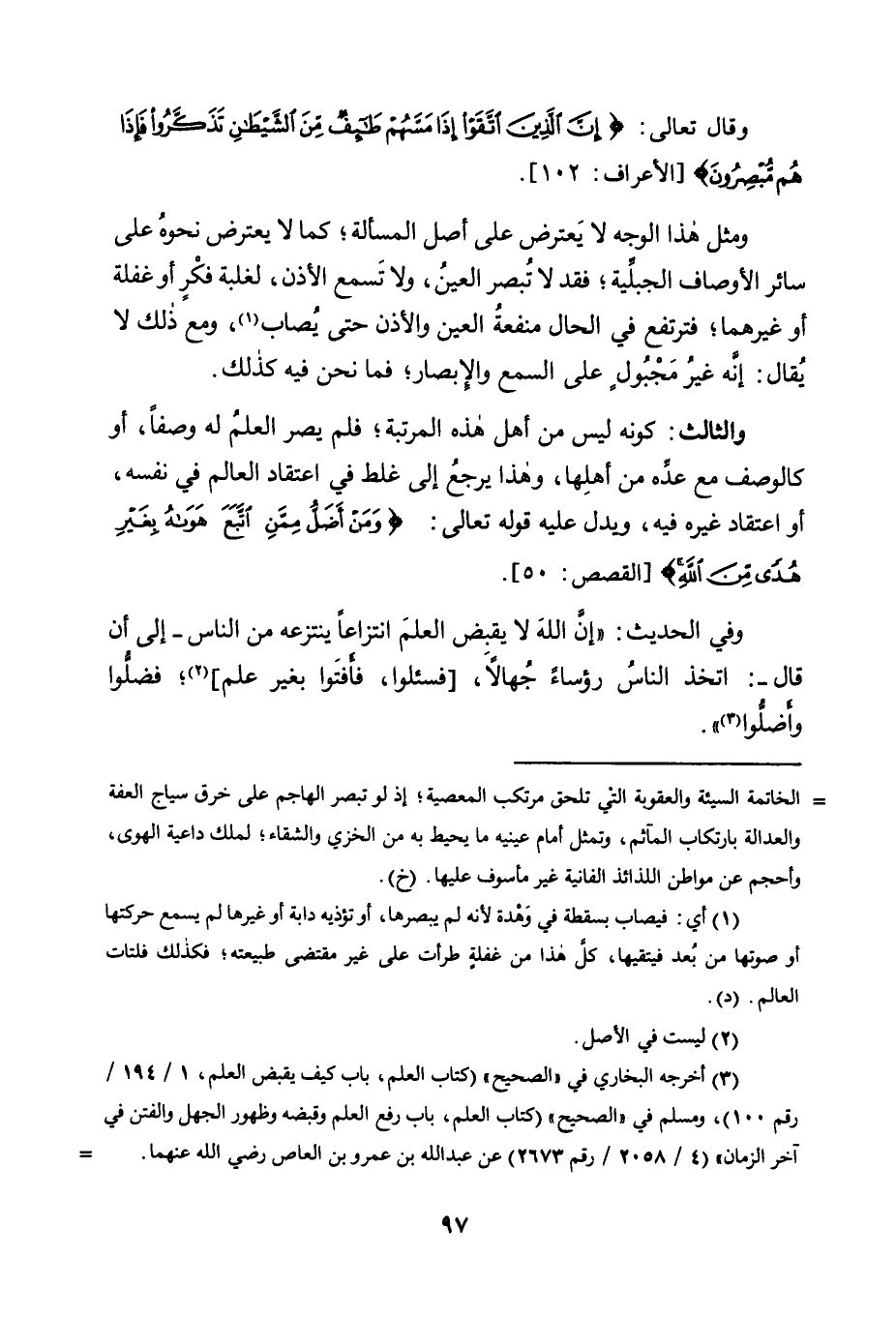 3 أخرجه البخاري في "الصحيح" "كتاب العلم، باب كيف يقبض العلم، 1/ 194/ رقم 100"، ومسلم في "الصحيح" "كتاب العلم، باب رفع العلم وقبضه وظهور الجهل والفتن في آخر الزمان" "4/ 2058/ رقم 2673" عن عبد الله بن عمرو بن العاص, رضي الله عنهما. وقد أسهبت في تخريجه في تعليقي على "الأوهام التي في مدخل أبي عبد الله الحاكم" "ص55-58"؛ فانظره هناك إن أردت الاستزادة، والله الهادي.