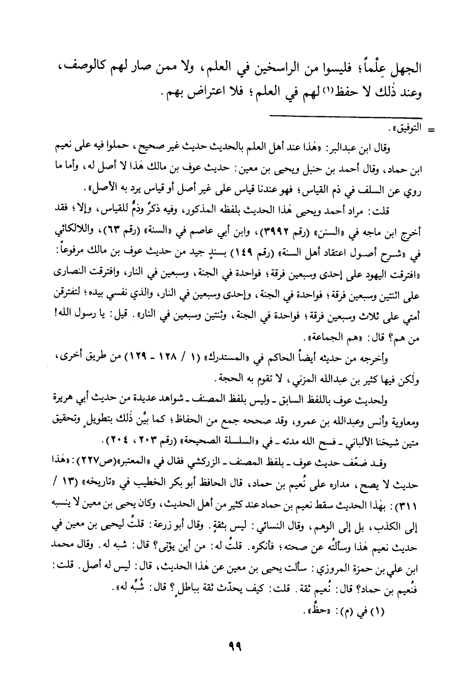 قلت: مراد أحمد ويحيى هذا الحديث بلفظه المذكور، وفيه ذكر وذمٌّ للقياس، وإلا؛ فقد أخرج ابن ماجه في "السنن" "رقم 3992"، وابن أبي عاصم في "السنة" "رقم 63"، واللالكائي في "شرح أصول اعتقاد أهل السنة" "رقم 149" بسند جيد من حديث عوف بن مالك مرفوعا: "افترقت اليهود على إحدى وسبعين فرقة؛ فواحدة في الجنة، وسبعين في النار، وافترقت النصارى على اثنتين وسبعين فرقة؛ فواحدة في الجنة، وإحدى وسبعين في النار، والذي نفسي بيده؛ لتفترقن أمتي على ثلاث وسبعين فرقة؛ فواحدة في الجنة، وثنتين وسبعين في النار ". قيل: يا رسول الله! من هم؟ قال: "هم الجماعة ".