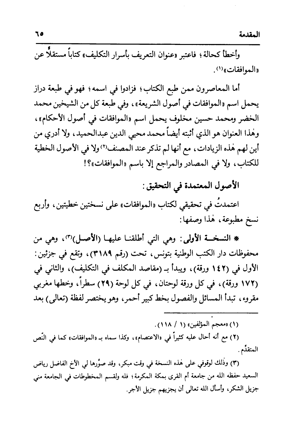اعتمدت في تحقيقي لكتاب "الموافقات" على نسختين خطيتين، وأربع نسخ مطبوعة، هذا وصفها: