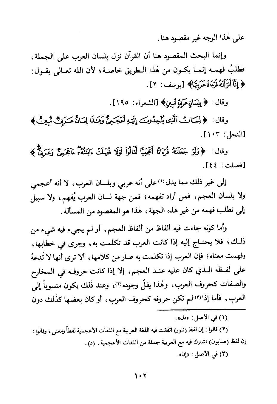 وَأَمَّا كَوْنُهُ جَاءَتْ فِيهِ أَلْفَاظٌ مِنْ أَلْفَاظِ الْعَجَمِ، أَوْ لَمْ يَجِئْ فِيهِ شَيْءٌ مِنْ ذَلِكَ، فَلَا يُحْتَاجُ إِلَيْهِ إِذَا كَانَتِ الْعَرَبُ قَدْ تَكَلَّمَتْ بِهِ، وَجَرَى فِي خِطَابِهَا، وَفَهِمَتْ مَعْنَاهُ، فَإِنَّ الْعَرَبَ إِذَا تَكَلَّمَتْ بِهِ صَارَ مِنْ كَلَامِهَا، أَلَا تَرَى أَنَّهَا لَا تَدَعُهُ عَلَى لَفْظِهِ الَّذِي كَانَ عَلَيْهِ عِنْدَ الْعَجَمِ، إِلَّا إِذَا كَانَتْ حُرُوفُهُ فِي الْمَخَارِجِ وَالصِّفَاتِ كَحُرُوفِ الْعَرَبِ، وَهَذَا يَقِلُّ وُجُودُهُ2، وَعِنْدَ ذَلِكَ يَكُونُ مَنْسُوبًا إِلَى الْعَرَبِ، فَأَمَّا إِذَا3 لَمْ تَكُنْ حُرُوفُهُ كَحُرُوفِ الْعَرَبِ، أَوْ كان بعضها كذلك دون
