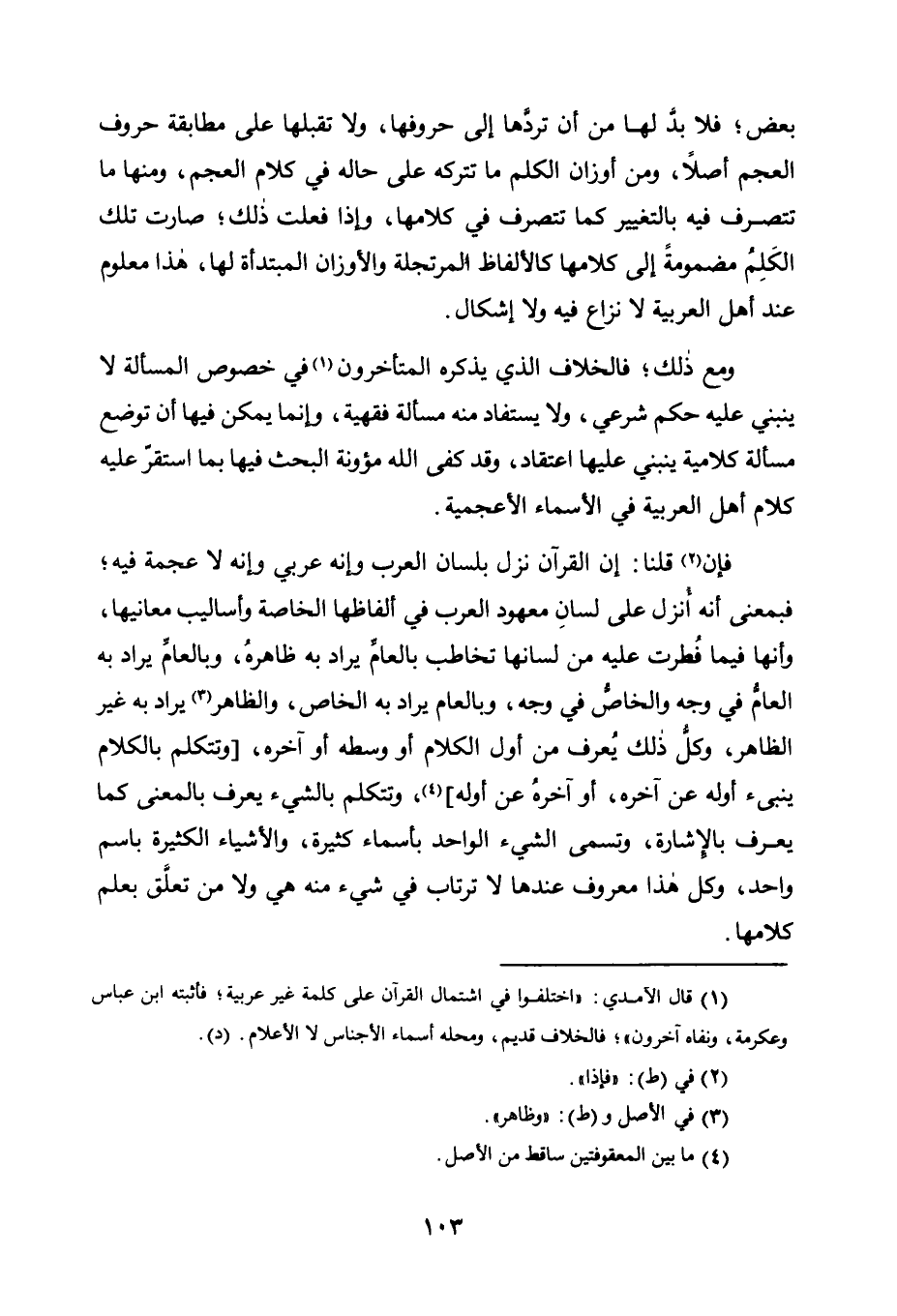 1 قال الآمدي: "اختلفوا في اشتمال القرآن على كلمة غير عربية، فأثبته ابن عباس وعكرمة، ونفاه آخرون"، فالخلاف قديم، ومحله أسماء الأجناس لا الأعلام. "د".