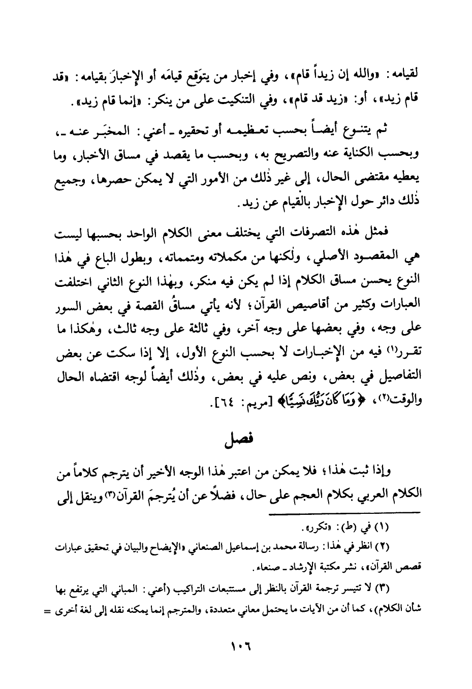 3 لا تتيسر ترجمة القرآن بالنظر إلى مستتبعات التراكيب "أعنى: المباني التي يرتفع بها شأن الكلام، كما أن من الآيات ما يحتمل معاني متعددة، والمترجم إنما يمكنه نقله إلى لغة أخرى بإحدى تلك المعاني، كما في قوله تعالى: {أَفَلا يَنْظُرُونَ إِلَى الْإِبِلِ كَيْفَ خُلِقَتْ} ، فقد رأيت مترجم القرآن إلى اللسان الألماني سلك في ترجمة لفظ الإبل معنى السحاب الذي هو أحد الوجهين في تفسيرها. "خ".