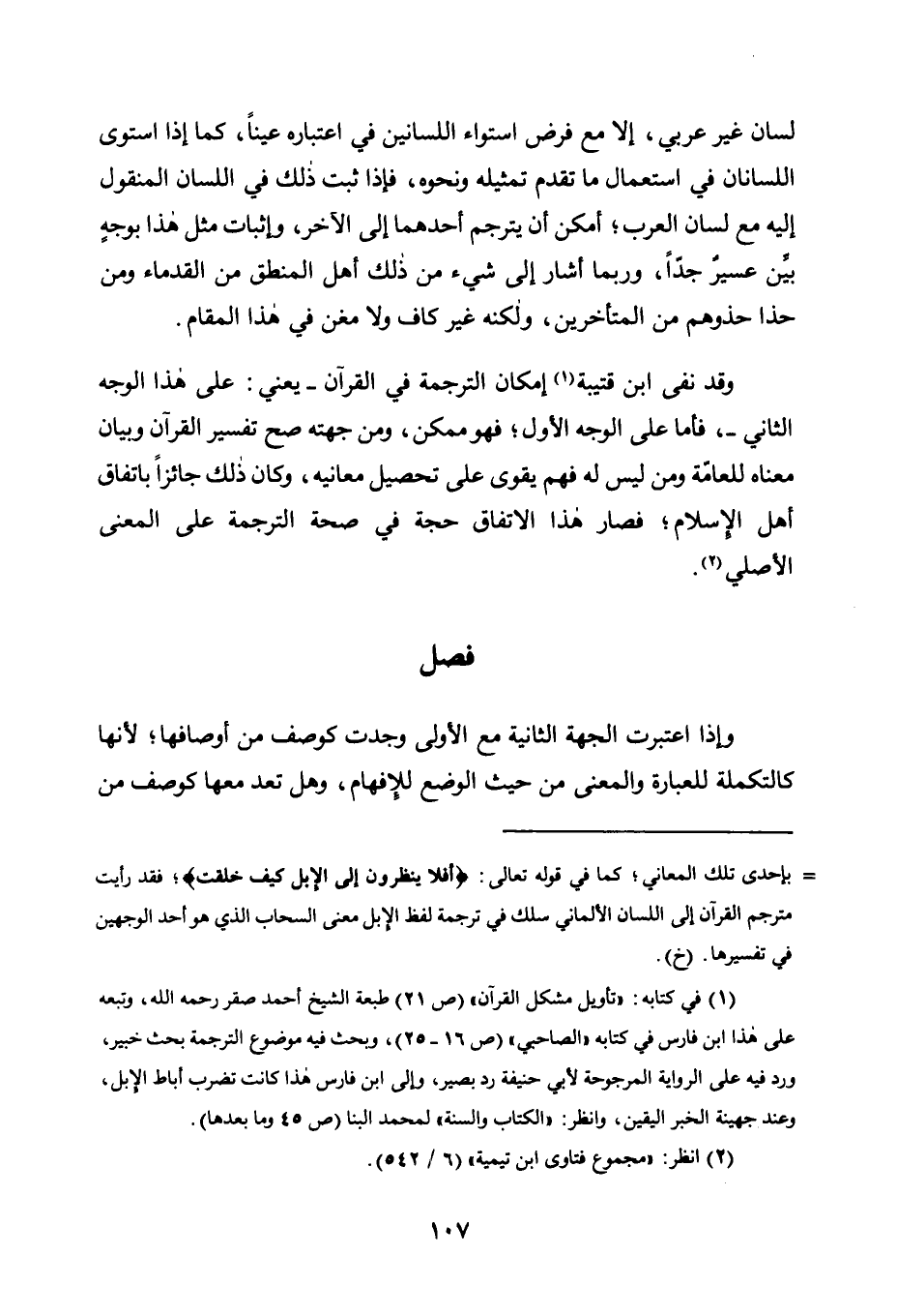 وَقَدْ نَفَى ابْنُ قُتَيْبَةَ1 إِمْكَانَ التَّرْجَمَةِ فِي الْقُرْآنِ -يَعْنِي: عَلَى هَذَا الْوَجْهِ الثَّانِي- فَأَمَّا عَلَى الْوَجْهِ الْأَوَّلِ، فَهُوَ مُمْكِنٌ، وَمِنْ جِهَتِهِ صَحَّ تَفْسِيرُ الْقُرْآنِ وَبَيَانُ مَعْنَاهُ لِلْعَامَّةِ وَمَنْ لَيْسَ لَهُ فَهْمٌ يَقْوَى عَلَى تَحْصِيلِ مَعَانِيهِ، وَكَانَ ذَلِكَ جَائِزًا بِاتِّفَاقِ أَهْلِ الْإِسْلَامِ، فَصَارَ هَذَا الِاتِّفَاقُ حُجَّةً فِي صِحَّةِ التَّرْجَمَةِ عَلَى الْمَعْنَى الْأَصْلِيِّ2.
