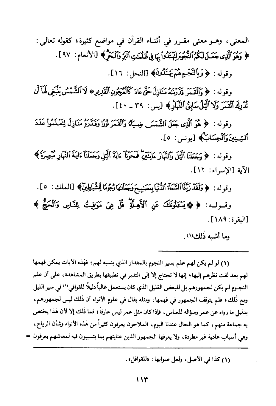 1 لو لم يكن لهم علم بسير النجوم بالمقدار الذي ينسبه لهم، فهذه الآيات يمكن فهمها لهم بعد لفت نظرهم إليها، إنها لا تحتاج إلا إلى التدبر في تطبيقها بطريق المشاهدة، على أن علم النجوم لم يكن لجمهورهم بل للبعض القليل الذي كان يستعمل غالبا دليلا للقوافي* في سير الليل ومع ذلك، فلم يتوقف الجمهور في فهمها، ومثله يقال في علوم الأنواء أن ذلك ليس لجمهورهم، بدليل ما رواه عن عمر وسؤاله للعباس، فإذا كان مثل عمر ليس عارفا، فما ذلك إلا لأن هذا يختص به جماعة منهم، كما هو الحال عندنا اليوم، الملاحون يعرفون كثيرا من هذه الأنواء وشأن الرياح، وهي أسباب عادية غير مطردة، ولا يعرفها الجمهور الذين عنايتهم بما يتسببون فيه لمعاشهم يعرفون=