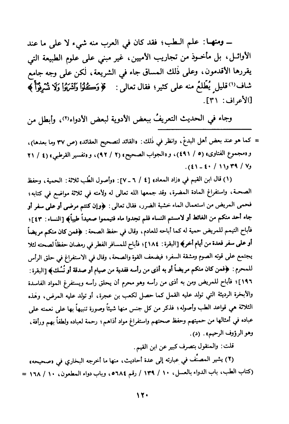 فَقَدْ كَانَ فِي الْعَرَبِ مِنْهُ شَيْءٌ لَا عَلَى مَا عِنْدَ الْأَوَائِلِ، بَلْ مَأْخُوذٌ مِنْ تَجَارِيبِ الْأُمِّيِّينَ، غَيْرُ مَبْنِيٍّ عَلَى عُلُومِ الطَّبِيعَةِ الَّتِي يُقَرِّرُهَا الْأَقْدَمُونَ، وَعَلَى ذَلِكَ الْمَسَاقِ جَاءَ فِي الشَّرِيعَةِ، لَكِنْ عَلَى وَجْهٍ جَامِعٍ شافٍ1 قليلٍ يُطَّلَعُ مِنْهُ عَلَى كَثِيرٍ، فَقَالَ تَعَالَى: {وَكُلُوا وَاشْرَبُوا وَلا تُسْرِفُوا} [الْأَعْرَافِ: 31] .