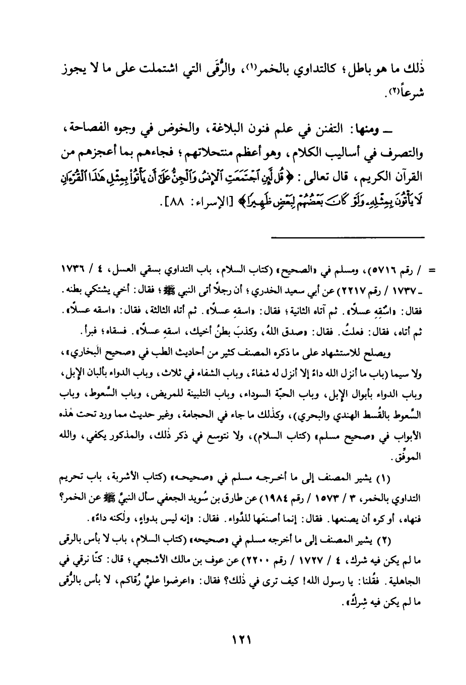 2 يشير المصنف إلى ما أخرجه مسلم في "صحيحه" "كتاب السلام، باب لا بأس بالرقى ما لم يكن فيه شرك، 4/ 1727/ رقم 2200" عن عوف بن مالك الأشجعي، قال: كنا نرقي في الجاهلية. فقلنا: يا رسول الله! كيف ترى في ذلك؟ فقال: "اعرضوا علي رقاكم، لا بأس بالرقى ما لم يكن فيه شرك".