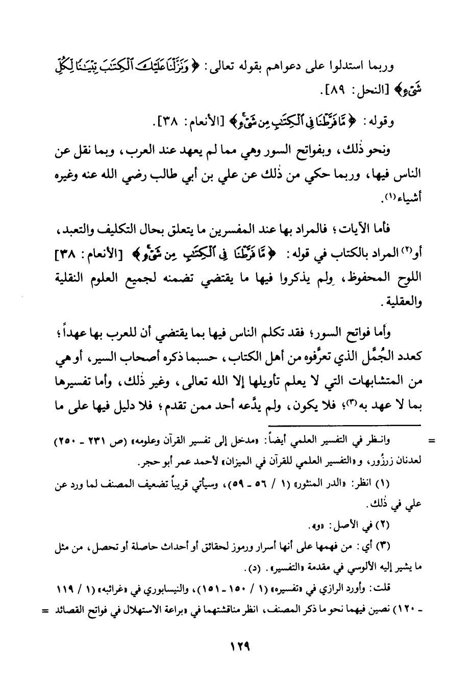 فَأَمَّا الْآيَاتُ، فَالْمُرَادُ بِهَا عِنْدَ الْمُفَسِّرِينَ مَا يَتَعَلَّقُ بِحَالِ التَّكْلِيفِ وَالتَّعَبُّدِ، أَوِ2 الْمُرَادُ بِالْكِتَابِ فِي قَوْلِهِ: {مَا فَرَّطْنَا فِي الْكِتَابِ مِنْ شَيْء} [الْأَنْعَامِ: 38] اللَّوْحُ الْمَحْفُوظُ، وَلَمْ يَذْكُرُوا فِيهَا مَا يَقْتَضِي تَضَمُّنَهُ لِجَمِيعِ الْعُلُومِ النَّقْلِيَّةِ وَالْعَقْلِيَّةِ.