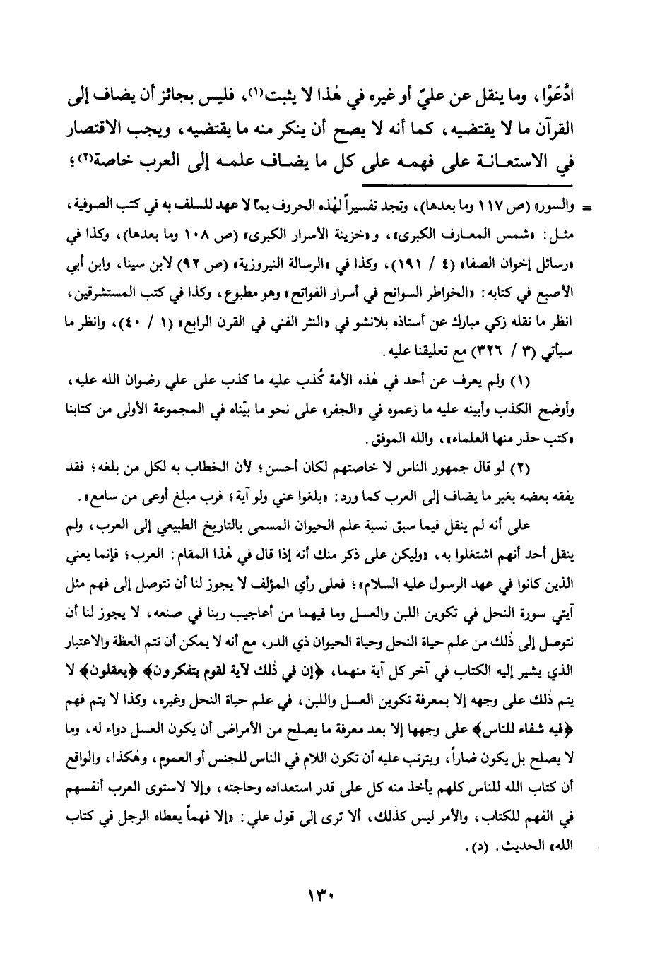 على أنه لم ينقل فيما سبق نسبة علم الحيوان المسمى بالتاريخ الطبيعي إلى العرب، ولم ينقل أحد أنهم اشتغلوا به، "وليكن على ذكر منك أنه إذا قال في هذا المقام: "العرب، فإنما يعني الذين كانوا في عهد الرسول عليه السلام"، فعلى رأي المؤلف لا يجوز لنا أن نتوصل إلى فهم مثل آيتي سورة النحل في تكوين اللبن والعسل وما فيهما من أعاجيب ربنا في صنعه، لا يجوز لنا أن نتوصل إلى ذلك من علم حياة النحل وحياة الحيوان ذي الدر، مع أنه لا يمكن أن تتم العظة والاعتبار الذي يشير إليه الكتاب في آخر كل آية منهما: {إِنَّ فِي ذَلِكَ لَآيَةً لِقَوْمٍ يَتَفَكَّرُون} ، {يَعْقِلُون} لا يتم ذلك على وجهه إلا بمعرفة تكوين العسل واللبن، في علم حياة النحل وغيره، وكذا لا يتم فهم: {فِيهِ شِفَاءٌ لِلنَّاس} على وجهها إلا بعد معرفة ما يصلح من الأمراض أن يكون العسل دواء له، وما لا يصلح بل يكون ضارًّا، ويترتب عليه أن تكون اللام في الناس للجنس أو العموم، وهكذا، والواقع أن كتاب الله للناس كلهم يأخذ منه كل على قدر استعداده وحاجته، وإلا لاستوى العرب أنفسهم في الفهم للكتاب، والأمر ليس كذلك، ألا ترى إلى قول علي: "إلا فهما يعطاه الرجل في كتاب الله" الحديث. "د".