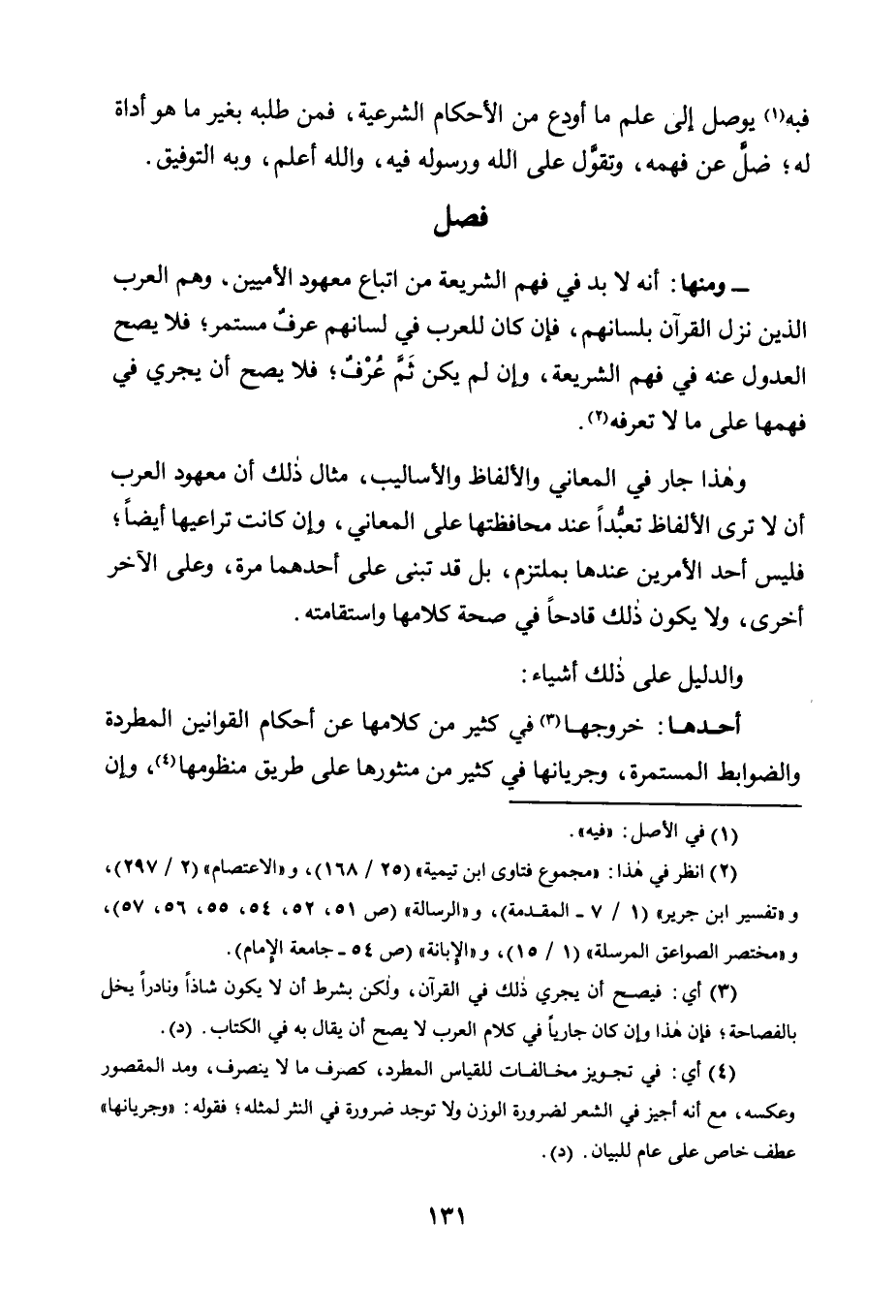 - وَمِنْهَا: أَنَّهُ لَا بُدَّ فِي فَهْمِ الشَّرِيعَةِ مِنِ اتِّبَاعِ مَعْهُودِ الْأُمِّيِّينَ، وَهُمُ الْعَرَبُ الَّذِينَ نَزَلَ الْقُرْآنُ بِلِسَانِهِمْ، فَإِنْ كَانَ لِلْعَرَبِ فِي لِسَانِهِمْ عُرْفٌ مُسْتَمِرٌّ، فَلَا يَصِحُّ الْعُدُولُ عَنْهُ فِي فَهْمِ الشَّرِيعَةِ، وَإِنْ لَمْ يَكُنْ ثَمَّ عُرْفٌ، فَلَا يَصِحُّ أَنْ يُجْرَى فِي فَهْمِهَا عَلَى مَا لَا تَعْرِفُهُ2.