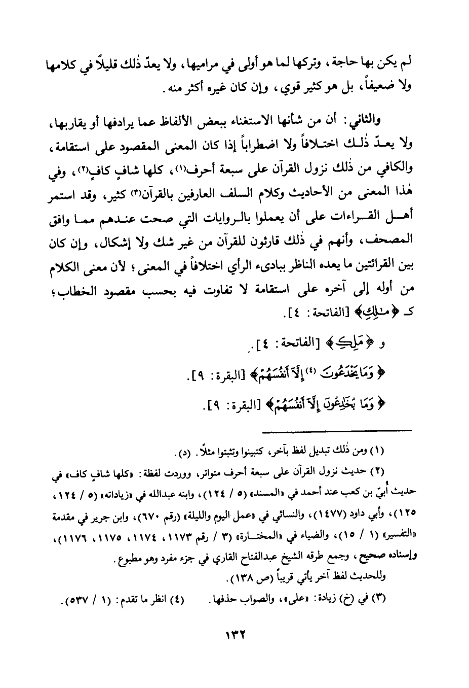 أَنَّ مِنْ شَأْنِهَا الِاسْتِغْنَاءَ بِبَعْضِ الْأَلْفَاظِ عَمَّا يرادفها أَوْ يُقَارِبُهَا، وَلَا يُعَدُّ ذَلِكَ اخْتِلَافًا وَلَا اضْطِرَابًا إِذَا كَانَ الْمَعْنَى الْمَقْصُودُ عَلَى اسْتِقَامَةٍ، وَالْكَافِي مِنْ ذَلِكَ نُزُولُ الْقُرْآنِ عَلَى سَبْعَةِ أَحْرُفٍ1، كُلُّهَا شافٍ كافٍ2، وَفِي هَذَا الْمَعْنَى مِنَ الْأَحَادِيثِ وَكَلَامِ السَّلَفِ الْعَارِفِينَ بِالْقُرْآنِ3 كَثِيرٌ، وَقَدِ اسْتَمَرَّ أَهْلُ الْقِرَاءَاتِ عَلَى أَنْ يَعْمَلُوا بِالرِّوَايَاتِ الَّتِي صَحَّتْ عِنْدَهُمْ مِمَّا وَافَقَ الْمُصْحَفَ، وَأَنَّهُمْ فِي ذَلِكَ قَارِئُونَ لِلْقُرْآنِ مِنْ غَيْرِ شك ولا إشكال، وإن كان بين القرائتين مَا يَعُدُّهُ النَّاظِرُ بِبَادِئِ الرَّأْيِ اخْتِلَافًا فِي الْمَعْنَى؛ لِأَنَّ مَعْنَى الْكَلَامِ مِنْ أَوَّلِهِ إِلَى آخِرِهِ عَلَى اسْتِقَامَةٍ لَا تَفَاوُتَ فِيهِ بِحَسَبِ مقصود الخطاب، كـ: {مَالِكِ} و "مَلِكِ" [الفاتحة: 4] . "د".