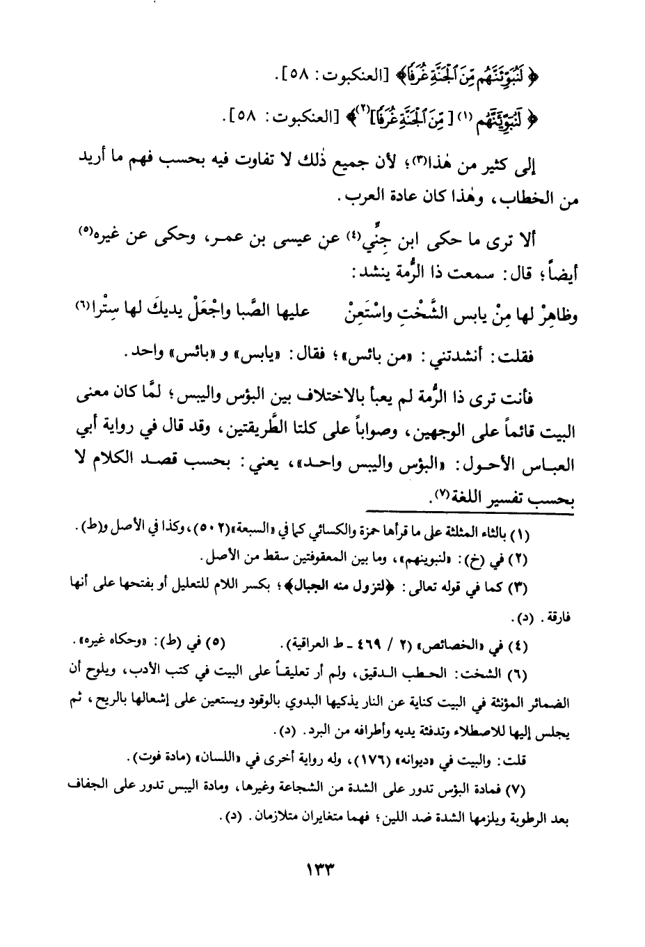 فَأَنْتَ تَرَى ذَا الرُّمَّةِ لَمْ يَعْبَأْ بِالِاخْتِلَافِ بَيْنَ الْبُؤْسِ وَالْيُبْسِ، لَمَّا كَانَ مَعْنَى الْبَيْتِ قَائِمًا عَلَى الْوَجْهَيْنِ، وَصَوَابًا عَلَى كِلْتَا الطَّرِيقَتَيْنِ، وَقَدْ قَالَ فِي رِوَايَةِ أَبِي الْعَبَّاسِ الْأَحْوَلِ: "الْبُؤْسُ وَالْيُبْسُ وَاحِدٌ"، يَعْنِي: بِحَسَبِ قَصْدِ الكلام لا بحسب تفسير اللغة7.