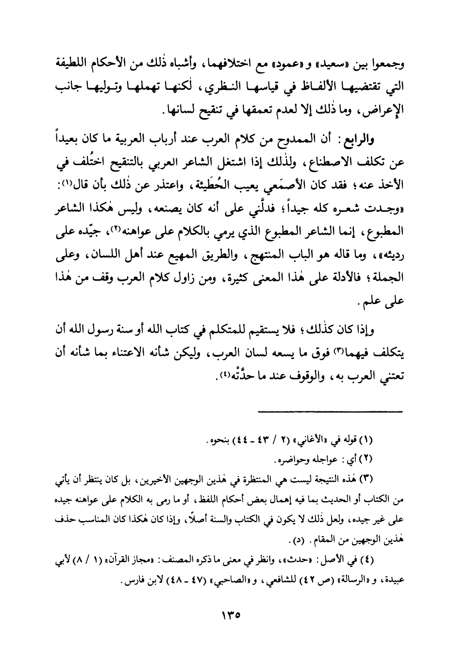 وجمعوا بين "سعيد" و"عمود" مَعَ اخْتِلَافِهِمَا، وَأَشْبَاهُ ذَلِكَ مِنَ الْأَحْكَامِ اللَّطِيفَةِ الَّتِي تَقْتَضِيهَا الْأَلْفَاظُ فِي قِيَاسِهَا النَّظَرِيِّ، لَكِنَّهَا تُهْمِلُهَا وَتُولِيهَا جَانِبَ الْإِعْرَاضِ، وَمَا ذَلِكَ إِلَّا لِعَدَمِ تَعَمُّقِهَا فِي تَنْقِيحِ لِسَانِهَا.