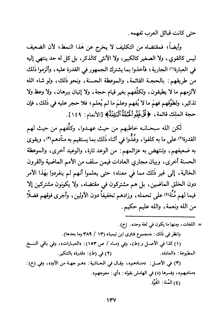 وَأَيْضًا، فَمُقْتَضَاهُ مِنَ التَّكْلِيفِ لَا يَخْرُجُ عَنْ هَذَا النَّمَطِ، لِأَنَّ الضَّعِيفَ لَيْسَ كَالْقَوِيِّ، وَلَا الصَّغِيرَ كَالْكَبِيرِ، وَلَا الْأُنْثَى كَالذَّكَرِ، بَلْ كُلٌّ لَهُ حَدٌّ ينتهي إليه في العبارة1 الْجَارِيَةِ، فَأَخَذُوا بِمَا يَشْتَرِكُ الْجُمْهُورُ فِي الْقُدْرَةِ عَلَيْهِ، وَأَلْزَمُوا ذَلِكَ مِنْ طَرِيقِهِمْ: بِالْحُجَّةِ الْقَائِمَةِ، وَالْمَوْعِظَةِ الْحَسَنَةِ، وَنَحْوِ ذَلِكَ، وَلَوْ شَاءَ اللَّهُ لَأَلْزَمَهُمْ مَا لَا يُطِيقُونَ، وَلَكَلَّفَهُمْ بِغَيْرِ قِيَامِ حُجَّةٍ، وَلَا إِتْيَانٍ بِبُرْهَانٍ، وَلَا وَعْظٍ وَلَا تَذْكِيرٍ، وَلَطَوَّقَهُمْ فَهْمَ مَا لَا يُفْهَمُ وَعِلْمَ مَا لَمْ يُعْلَمْ، فَلَا حِجْرَ عَلَيْهِ فِي ذَلِكَ، فَإِنَّ حُجَّةَ الْمُلْكِ قَائِمَةٌ: {قُلْ فَلِلَّهِ الْحُجَّةُ الْبَالِغَةُ} [الْأَنْعَامِ: 149] .