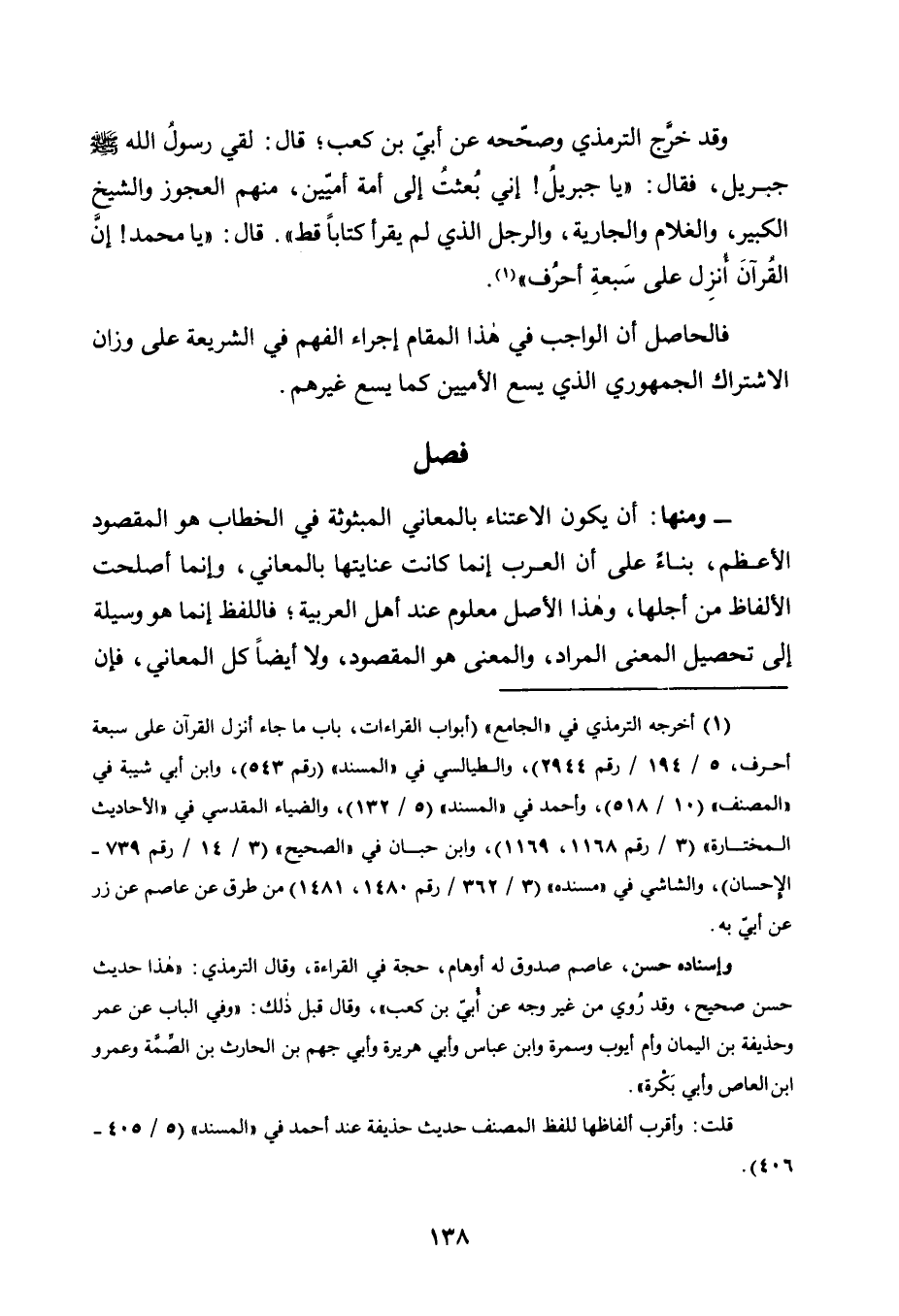 وَقَدْ خَرَّجَ التِّرْمِذِيُّ وَصَحَّحَهُ عَنْ أُبَيِّ بْنِ كَعْبٍ، قَالَ: لَقِيَ رَسُولُ اللَّهِ صَلَّى اللَّهُ عَلَيْهِ وَسَلَّمَ جِبْرِيلَ، فَقَالَ: "يَا جِبْرِيلُ! إِنِّي بُعِثْتُ إِلَى أُمَّةٍ أُمِّيِّينَ، مِنْهُمُ الْعَجُوزُ وَالشَّيْخُ الْكَبِيرُ وَالْغُلَامُ وَالْجَارِيَةُ، وَالرَّجُلُ الَّذِي لَمْ يَقْرَأْ كِتَابًا قَطُّ ". قَالَ: "يَا مُحَمَّدُ! إِنَّ الْقُرْآنَ أُنْزِلَ عَلَى سَبْعَةِ أَحْرُفٍ" 1.