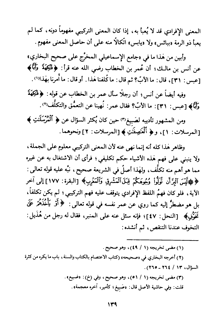 وَظَاهِرُ هَذَا كُلِّهِ أَنَّهُ إِنَّمَا نَهَى عَنْهُ لِأَنَّ الْمَعْنَى التَّرْكِيبِيَّ مَعْلُومٌ عَلَى الْجُمْلَةِ، وَلَا يَنْبَنِي عَلَى فَهْمِ هَذِهِ الْأَشْيَاءِ حُكْمٌ تَكْلِيفِيٌّ، فَرَأَى أَنَّ الِاشْتِغَالَ بِهِ عَنْ غَيْرِهِ مِمَّا هُوَ أَهَمُّ مِنْهُ تكلُّفٌ، وَلِهَذَا أَصْلٌ فِي الشَّرِيعَةِ صَحِيحٌ، نَبَّهَ عَلَيْهِ قَوْلُهُ تَعَالَى: {لَيْسَ الْبِرَّ أَنْ تُوَلُّوا وُجُوهَكُمْ قِبَلَ الْمَشْرِقِ وَالْمَغْرِبِ} [الْبَقَرَةِ: 177] إِلَى آخِرِ الْآيَةِ: فَلَوْ كَانَ فَهْمُ اللَّفْظِ الْإِفْرَادِيِّ يَتَوَقَّفُ عَلَيْهِ فَهْمُ التَّرْكِيبِيِّ، لَمْ يَكُنْ تَكُلُّفًا، بَلْ هُوَ مُضْطَرٌّ إِلَيْهِ كَمَا رُوِيَ عَنْ عُمَرَ نَفْسِهِ فِي قَوْلِهِ تَعَالَى: {أَوْ يَأْخُذَهُمْ عَلَى تَخَوُّف} [النَّحْلِ: 47] ، فَإِنَّهُ سُئِلَ عَنْهُ عَلَى الْمِنْبَرِ، فَقَالَ لَهُ رَجُلٌ مِنْ هُذَيْلٍ: التَّخَوُّفُ عِنْدَنَا التنقص، ثم أنشده: