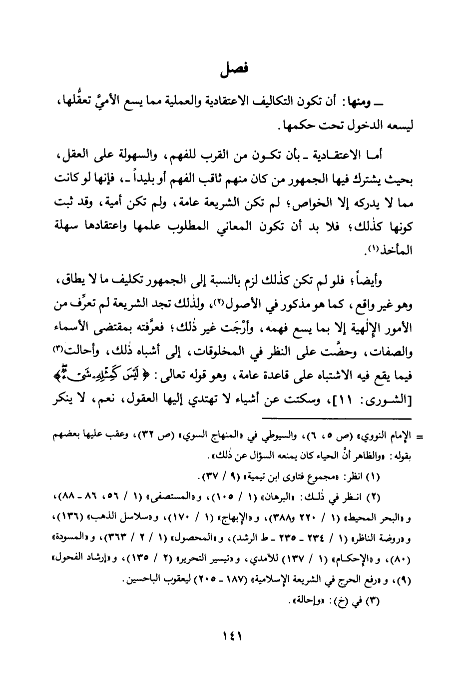 - وَمِنْهَا: أَنْ تَكُونَ التَّكَالِيفُ الِاعْتِقَادِيَّةُ وَالْعَمَلِيَّةُ مِمَّا يَسَعُ الْأُمِّيَّ تَعَقُّلُهَا، لِيَسَعَهُ الدُّخُولُ تَحْتَ حُكْمِهَا.