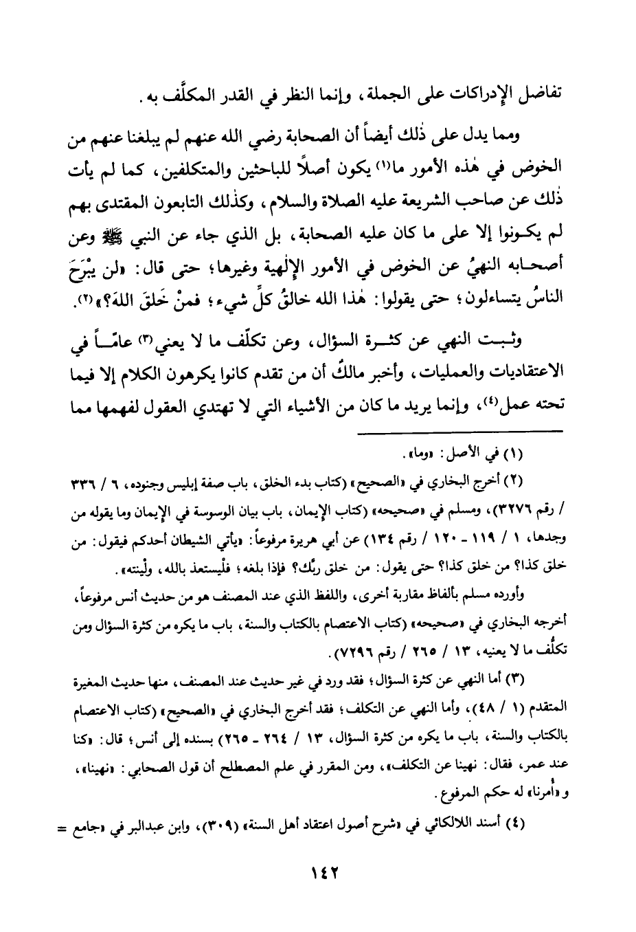 وَمِمَّا يَدُلُّ عَلَى ذَلِكَ أَيْضًا أَنَّ الصَّحَابَةَ رَضِيَ اللَّهُ عَنْهُمْ لَمْ يَبْلُغْنَا عَنْهُمْ مِنَ الْخَوْضِ فِي هَذِهِ الْأُمُورِ مَا1 يَكُونُ أَصْلًا لِلْبَاحِثِينَ وَالْمُتَكَلِّفِينَ، كَمَا لَمْ يَأْتِ ذَلِكَ عَنْ صَاحِبِ الشَّرِيعَةِ عَلَيْهِ الصَّلَاةُ وَالسَّلَامُ، وَكَذَلِكَ التَّابِعُونَ الْمُقْتَدَى بِهِمْ لَمْ يَكُونُوا إِلَّا عَلَى مَا كَانَ عَلَيْهِ الصَّحَابَةُ، بَلِ الَّذِي جَاءَ عَنِ النَّبِيِّ صَلَّى اللَّهُ عَلَيْهِ وَسَلَّمَ وَعَنْ أَصْحَابِهِ النَّهْيُ عَنِ الْخَوْضِ فِي الْأُمُورِ الْإِلَهِيَّةِ وَغَيْرِهَا، حَتَّى قَالَ: "لَنْ يَبْرَحَ النَّاسُ يَتَسَاءَلُونَ، حَتَّى يَقُولُوا: هَذَا اللَّهُ خَالِقُ كُلِّ شَيْءٍ، فَمَنْ خَلَقَ اللَّهَ؟ " 2.