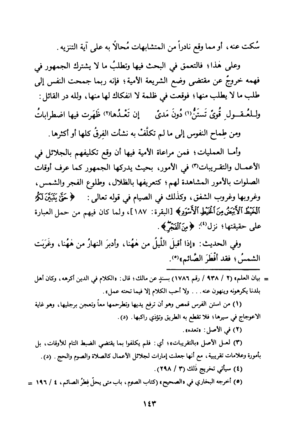 وَأَمَّا الْعَمَلِيَّاتُ، فَمِنْ مُرَاعَاةِ الْأُمِّيَّةِ فِيهَا أَنْ وَقَعَ تَكْلِيفُهُمْ بِالْجَلَائِلِ فِي الْأَعْمَالِ وَالتَّقْرِيبَاتِ3 فِي الْأُمُورِ، بِحَيْثُ يُدْرِكُهَا الْجُمْهُورُ كَمَا عَرَّفَ أَوْقَاتَ الصَّلَوَاتِ بِالْأُمُورِ الْمُشَاهَدَةِ لَهُمْ، كَتَعْرِيفِهَا بِالظِّلَالِ، وَطُلُوعِ الْفَجْرِ وَالشَّمْسِ، وَغُرُوبِهَا وَغُرُوبِ الشَّفَقِ، وَكَذَلِكَ فِي الصِّيَامِ فِي قَوْلِهِ تَعَالَى: {حَتَّى يَتَبَيَّنَ لَكُمُ الْخَيْطُ الْأَبْيَضُ مِنَ الْخَيْطِ الْأَسْوَدِ} [الْبَقَرَةِ: 187] ، وَلَمَّا كَانَ فِيهِمْ مَنْ حَمَلَ الْعِبَارَةَ عَلَى حَقِيقَتِهَا، نَزَلَ4: {مِنَ الْفَجْرِ} .