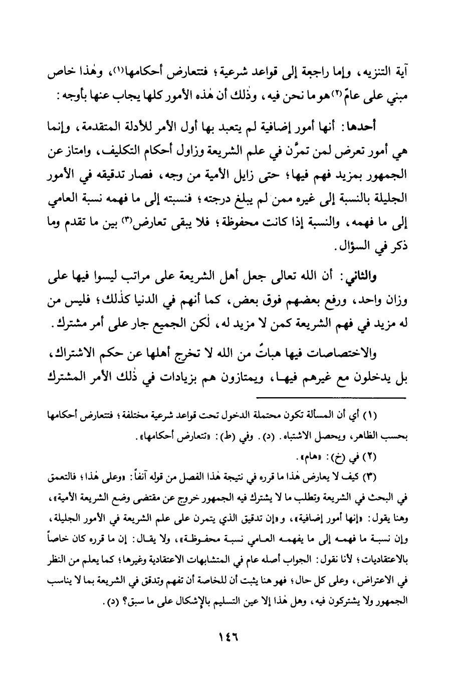 3 كيف لا يعارض هذا ما قرره في نتيجة هذا الفصل من قوله آنفا: "وعلى هذا، فالتعمق في البحث في الشريعة وتطلب ما لا يشترك فيه الجمهور خروج عن مقتضى وضع الشريعة الأمية"، وهنا يقول: "إنها أمور إضافية"، و"إن تدقيق الذي يتمرن على علم الشريعة في الأمور الجليلة، وإن نسبة ما فهمه إلى ما يفهمه العامي نسبة محفوظة"، ولا يقال: إن ما قرره كان خاصا بالاعتقاديات، لأنا نقول: الجواب أصله عام في المتشابهات الاعتقادية وغيرها، كما يعلم من النظر في الاعتراض، وعلى كل حال، فهو هنا يثبت أن للخاصة أن تفهم وتدقق في الشريعة بما لا يناسب الجمهور ولا يشتركون فيه، وهل هذا إلا عين التسليم بالإشكال على ما سبق؟ "د".