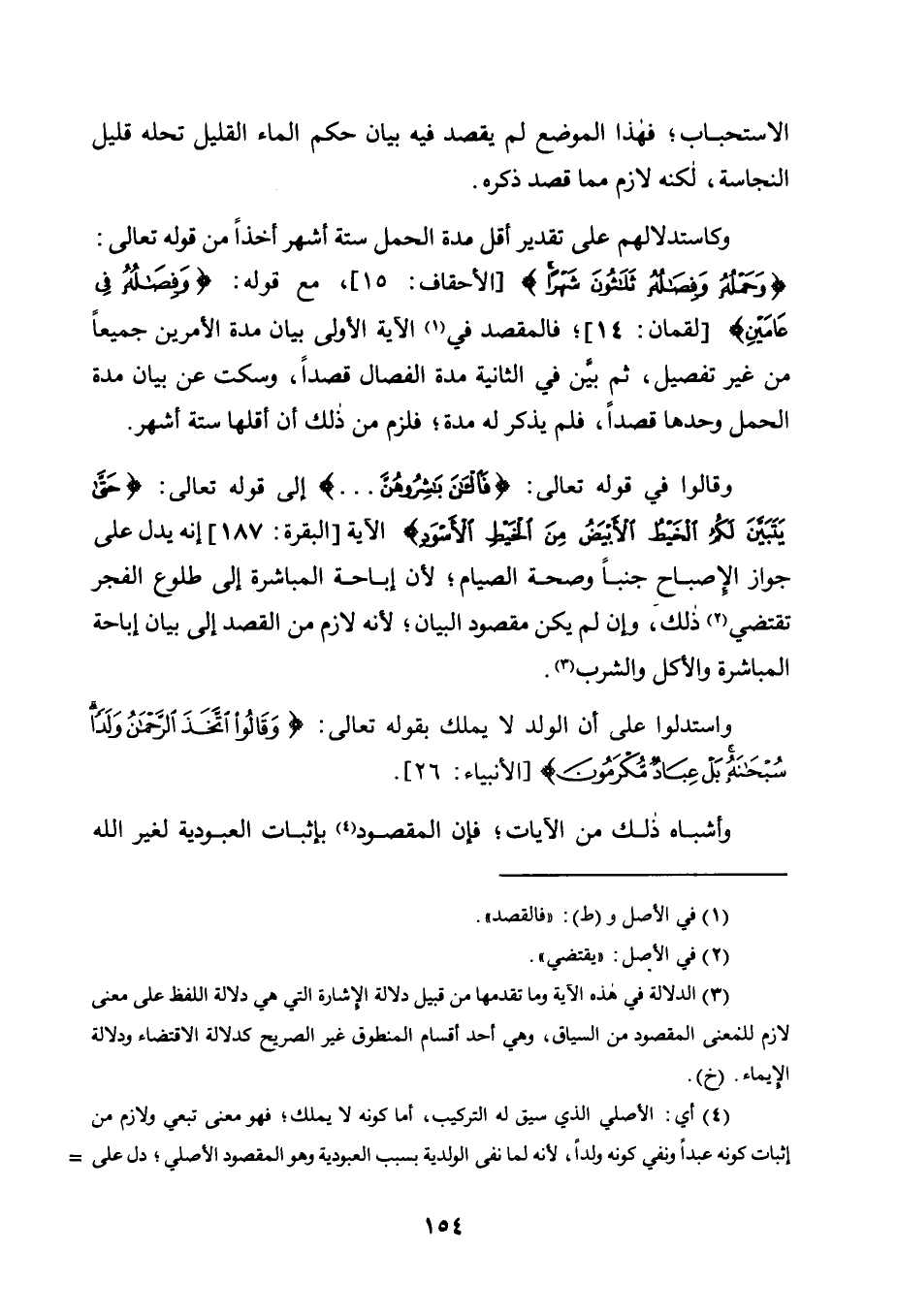 وَكَاسْتِدْلَالِهِمْ عَلَى تَقْدِيرِ أَقَلِّ مُدَّةِ الْحَمْلِ سِتَّةَ أَشْهُرٍ أَخْذًا مِنْ قَوْلِهِ تَعَالَى: {وَحَمْلُهُ وَفِصَالُهُ ثَلاثُونَ شَهْرًا} [الْأَحْقَافِ: 15] ، مَعَ قَوْلِهِ: {وَفِصَالُهُ فِي عَامَيْنِ} [لُقْمَانَ: 14] ، فَالْمَقْصِدُ فِي1 الْآيَةِ الْأُولَى بَيَانُ مُدَّةِ الْأَمْرَيْنِ جَمِيعًا مِنْ غَيْرِ تَفْصِيلٍ، ثُمَّ بَيَّنَ فِي الثَّانِيَةِ مُدَّةَ الْفِصَالِ قَصْدًا، وَسَكَتَ عَنْ بَيَانِ مُدَّةِ الْحَمْلِ وَحْدَهَا قَصْدًا، فَلَمْ يَذْكُرْ لَهُ مُدَّةً فَلَزِمَ مِنْ ذَلِكَ أَنَّ أَقَلَّهَا سِتَّةُ أَشْهُرٍ.