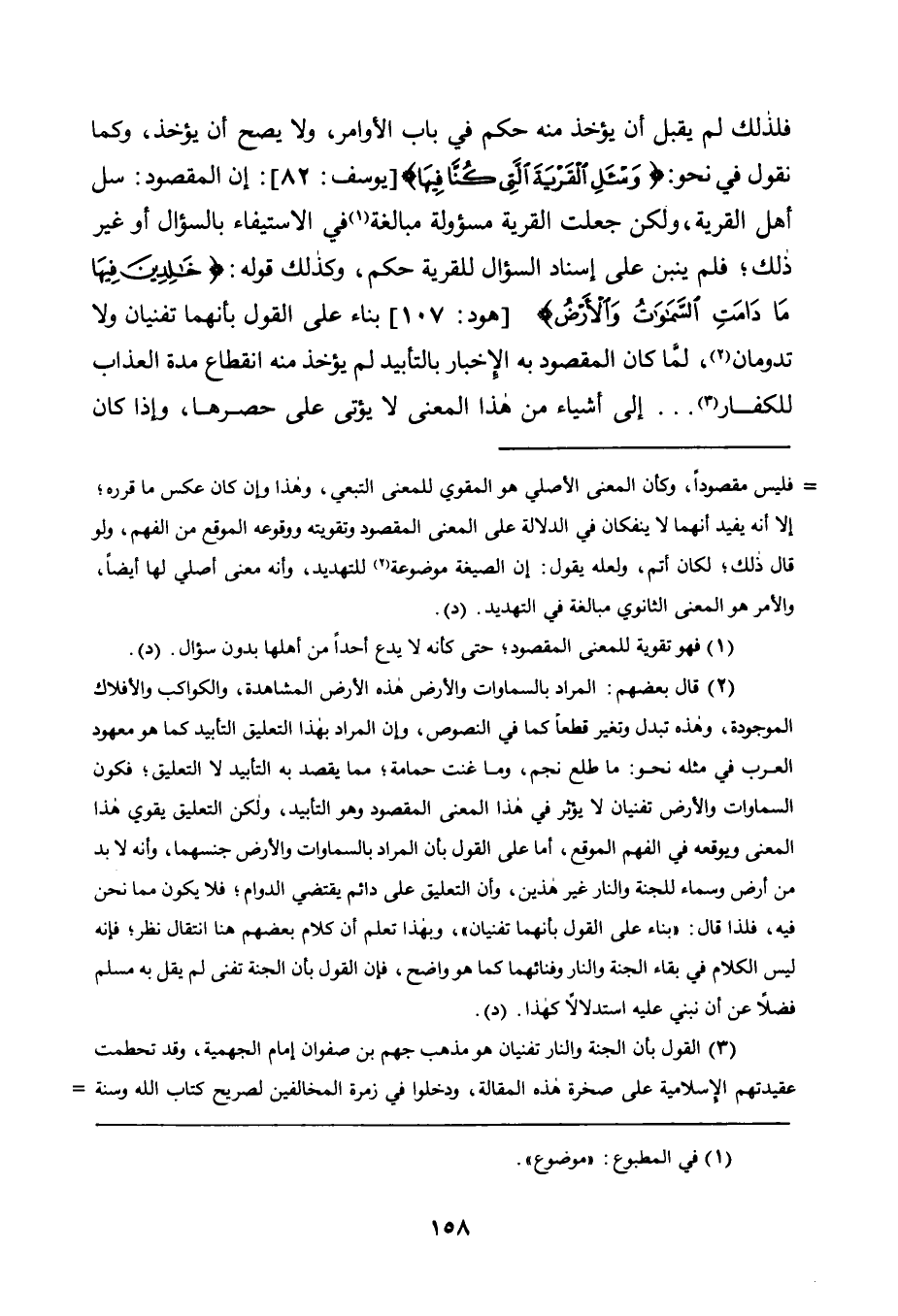 فَلِذَلِكَ لَمْ يُقْبَلْ أَنْ يُؤْخَذَ مِنْهُ حُكْمٌ فِي بَابِ الْأَوَامِرِ، وَلَا يَصِحُّ أَنْ يُؤْخَذَ، وَكَمَا نَقُولُ فِي نَحْوِ: {وَاسْأَلِ الْقَرْيَةَ الَّتِي كُنَّا فِيهَا} [يُوسُفَ: 82] : إِنَّ الْمَقْصُودَ: سَلْ أَهْلَ الْقَرْيَةِ، وَلَكِنْ جُعِلَتِ الْقَرْيَةُ مَسْئُولَةً مُبَالَغَةً1 فِي الِاسْتِيفَاءِ بِالسُّؤَالِ أَوْ غَيْرَ ذَلِكَ، فَلَمْ ينبنِ عَلَى إِسْنَادِ السُّؤَالِ لِلْقَرْيَةِ حُكْمٌ، وَكَذَلِكَ قَوْلُهُ: {خَالِدِينَ فِيهَا مَا دَامَتِ السَّمَوَاتُ وَالْأَرْضُ} [هُودٍ: 107] بِنَاءً عَلَى الْقَوْلِ بِأَنَّهُمَا تَفْنَيَانِ وَلَا تَدُومَانِ2، لَمَّا كَانَ الْمَقْصُودُ بِهِ الْإِخْبَارَ بِالتَّأْبِيدِ لَمْ يُؤْخَذْ مِنْهُ انْقِطَاعُ مُدَّةِ الْعَذَابِ لِلْكُفَّارِ3 ... إِلَى أَشْيَاءَ مِنْ هَذَا الْمَعْنَى لَا يؤتى على حصرها، وإذا كان