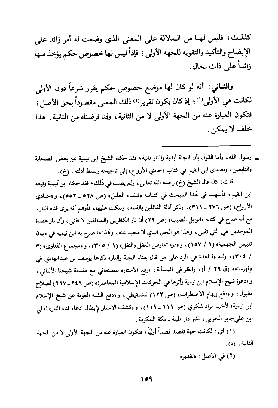 قلت: كذا قال الشيخ "خ" رحمه الله تعالى، ولم يصب في ذلك، فقد حكاه ابن تيمية وتبعه ابن القيم، فأسهب في هذا المبحث في كتابيه "شفاء العليل" "ص528-552"، و"حادي الأرواح" "ص276-311"، وذكر أدلة القائلين بالفناء، وسكت عليها، فأوهم أنه يرى فناء النار، مع أنه صرح في كتابه "الوابل الصيب" "ص29" أن نار الكافرين والمنافقين لا تفنى، وأن نار عصاة الموحدين هي التي تفنى، وهذا هو الحق الذي لا محيد عنه، وهذا ما صرح به ابن تيمية في "بيان تلبيس الجهمية" "1/ 157"، و"درء تعارض العقل والنقل" "1/ 305"، و"مجموع الفتاوى" "3/ 304"، وله "قاعدة في الرد على من قال بفناء الجنة والنار" ذكرها يوسف بن عبد الهادي في "فهرسته" "ق 26/ أ"، وانظر في المسألة: "رفع الأستار" للصنعاني مع مقدمة شيخنا الألباني، و"دعوة شيخ الإسلام ابن تيمية وأثرها في الحركات الإسلامية المعاصرة" "ص246-267" لصلاح مقبول، و"دفع إيهام الاضطراب" "ص122" للشنقيطي، و"دفع الشبه الغوية عن شيخ الإسلام ابن تيمية" لأخينا مراد شكري "ص111-119"، و"كشف الأستار لإبطال ادعاء فناء النار" لعلي بن علي جابر الحربي، نشر دار طيبة- مكة المكرمة.