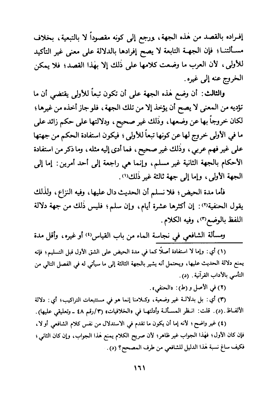 1 أي: وإما لا استفادة أصلا كما في مدة الحيض على الشق الأول قبل التسليم، فإنه يمنع دلالة الحديث عليها، ويحتمل أنه يشير بالجهة الثالثة إلى ما سيأتي له في الفصل التالي من التأسي بالآداب القرآنية. "د".